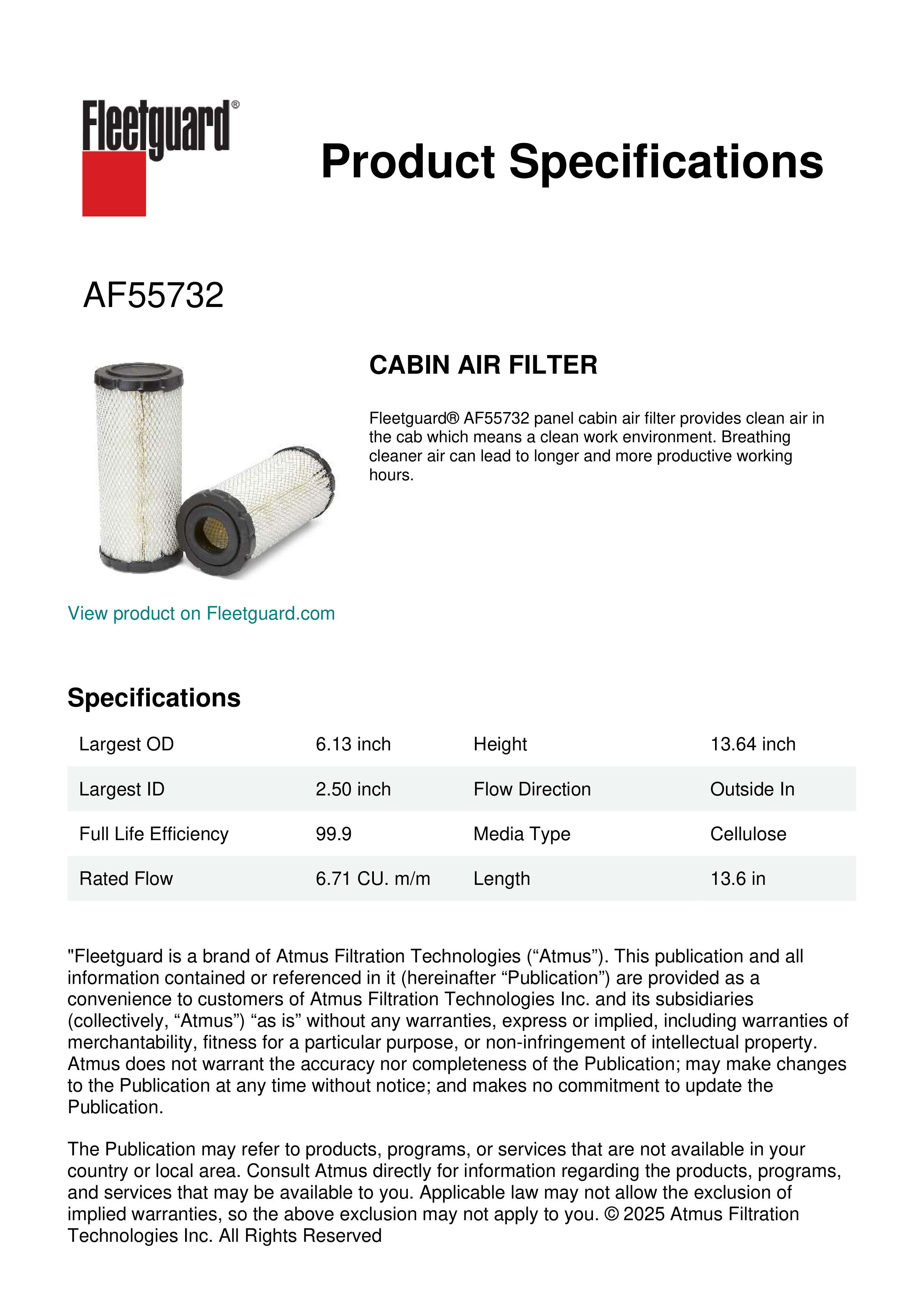 Fleetguard® AF55732 panel cabin air filter provides clean air in the cab which means a clean work environment. Breathing cleaner air can lead to longer and more productive working hours.Specification
