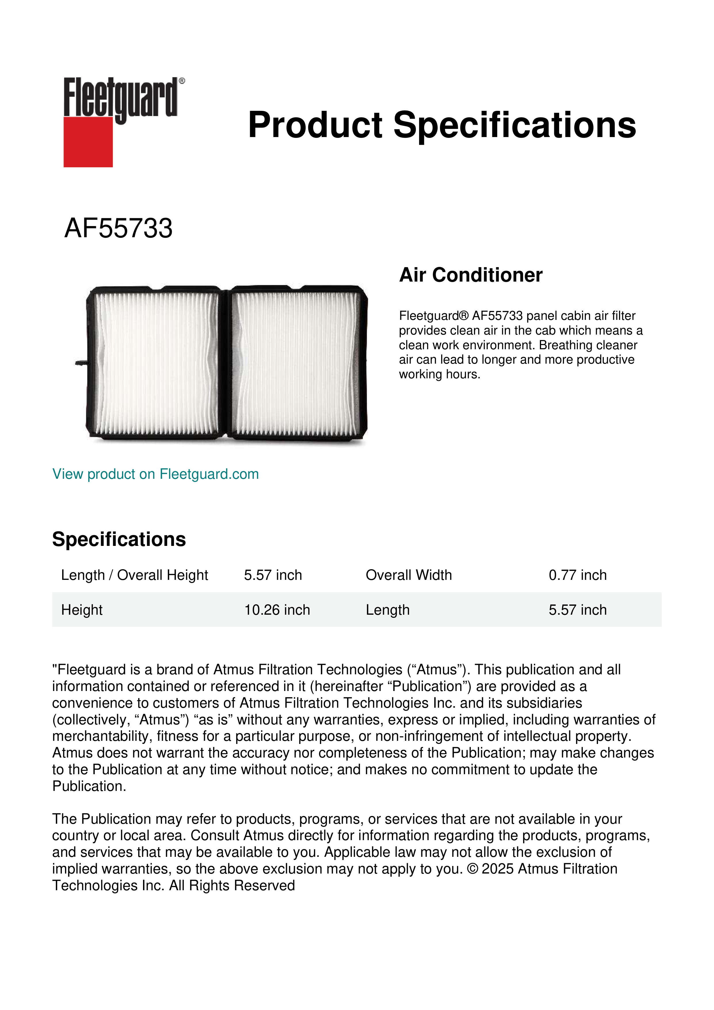 Fleetguard® AF55733 panel cabin air filter provides clean air in the cab which means a clean work environment. Breathing cleaner air can lead to longer and more productive working hours.Specification