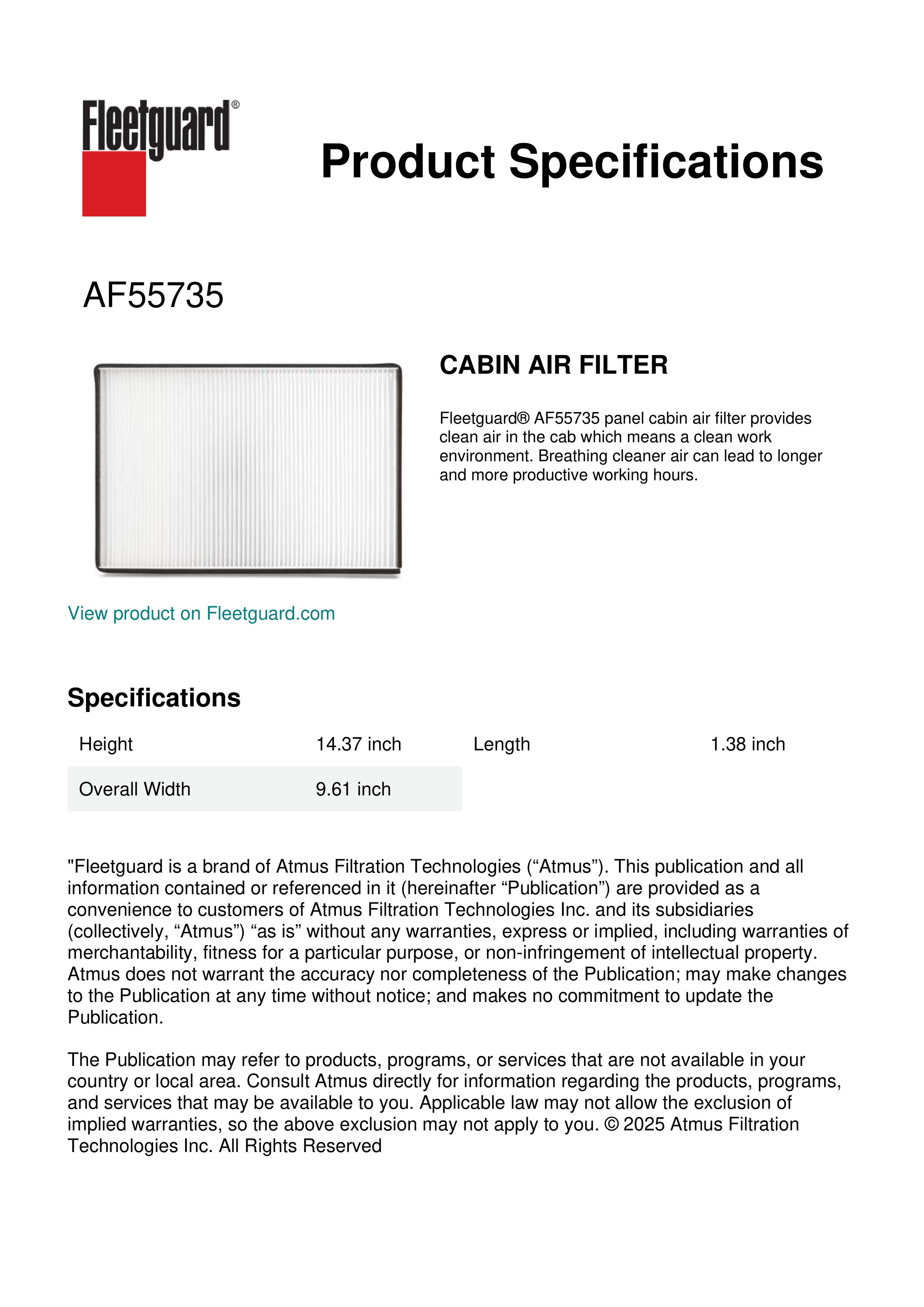 Fleetguard® AF55735 panel cabin air filter provides clean air in the cab which means a clean work environment. Breathing cleaner air can lead to longer and more productive working hours.Specification