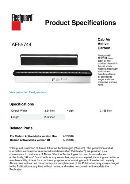 Fleetguard® AF55744 panel cabin air filter provides clean air in the cab which means a clean work environment. Breathing cleaner air can lead to longer and more productive working hours.Specification