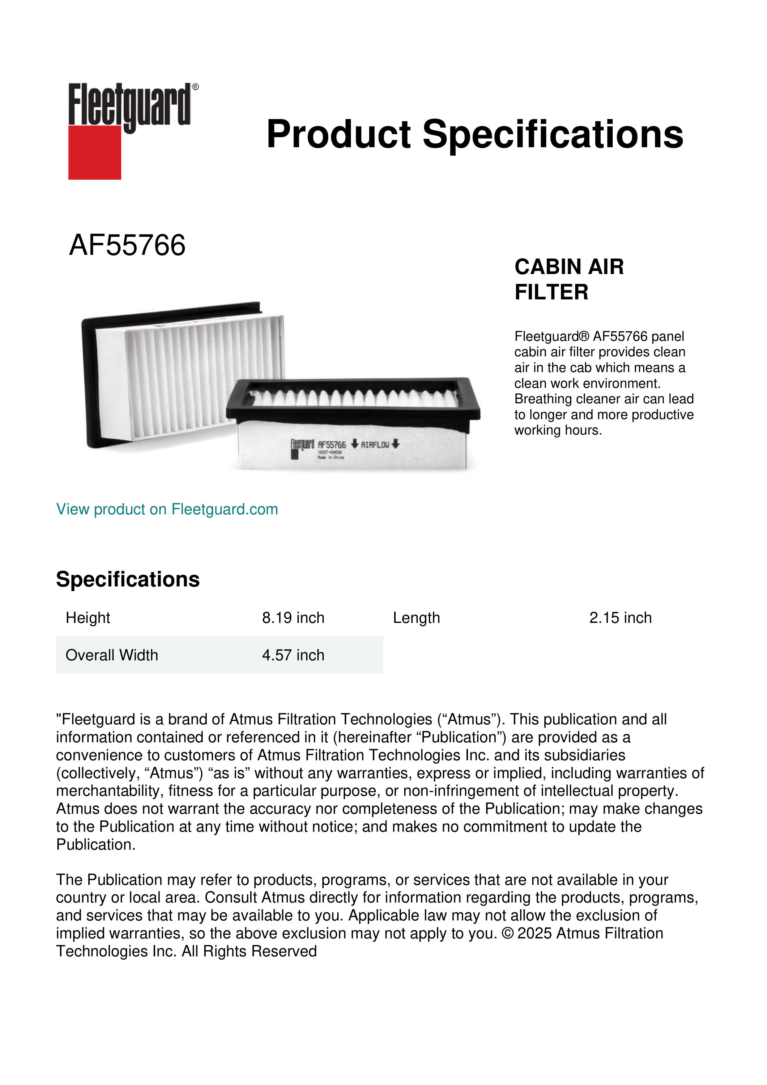 Fleetguard® AF55766 panel cabin air filter provides clean air in the cab which means a clean work environment. Breathing cleaner air can lead to longer and more productive working hours.Specification