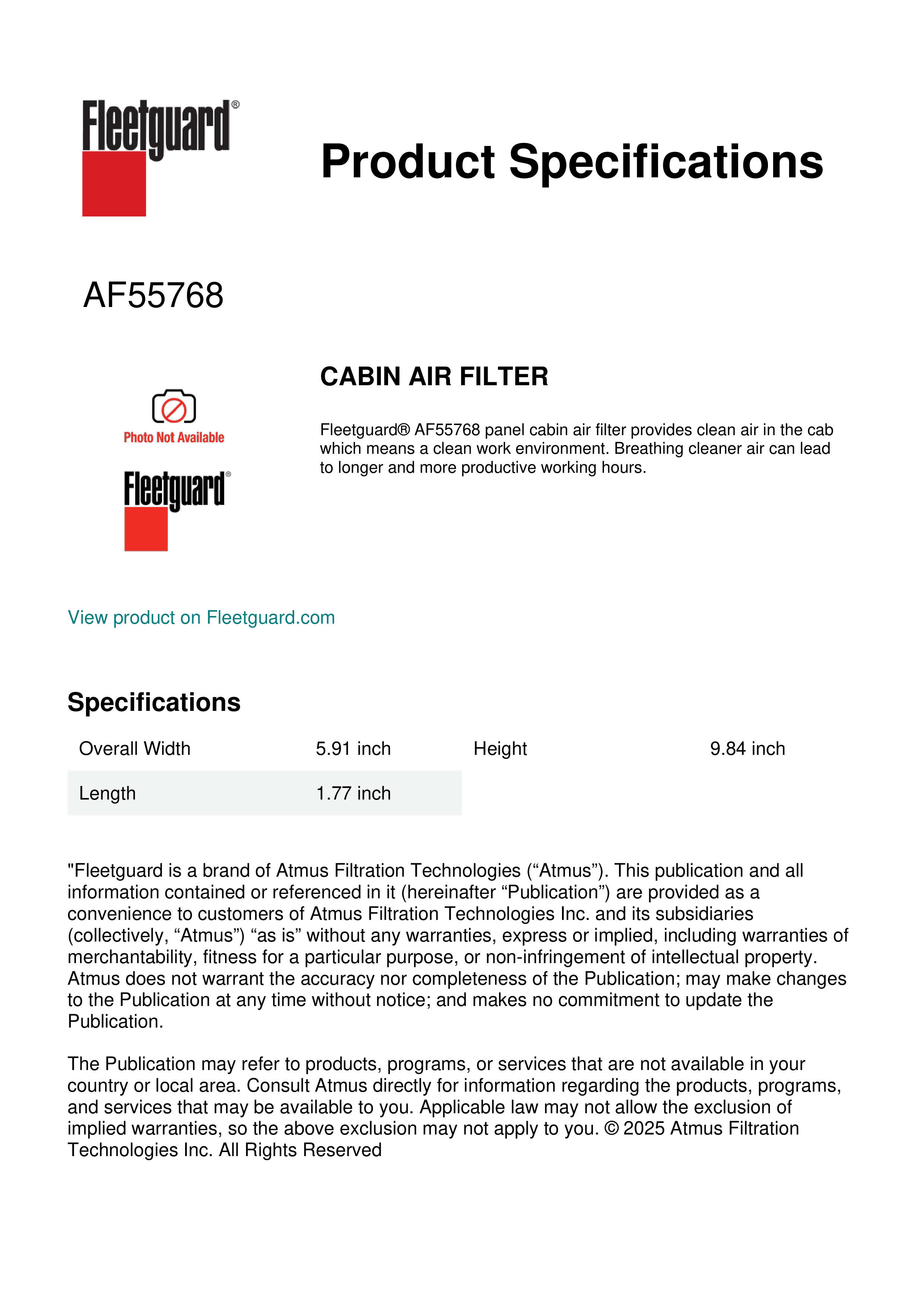 Fleetguard® AF55768 panel cabin air filter provides clean air in the cab which means a clean work environment. Breathing cleaner air can lead to longer and more productive working hours.Specification