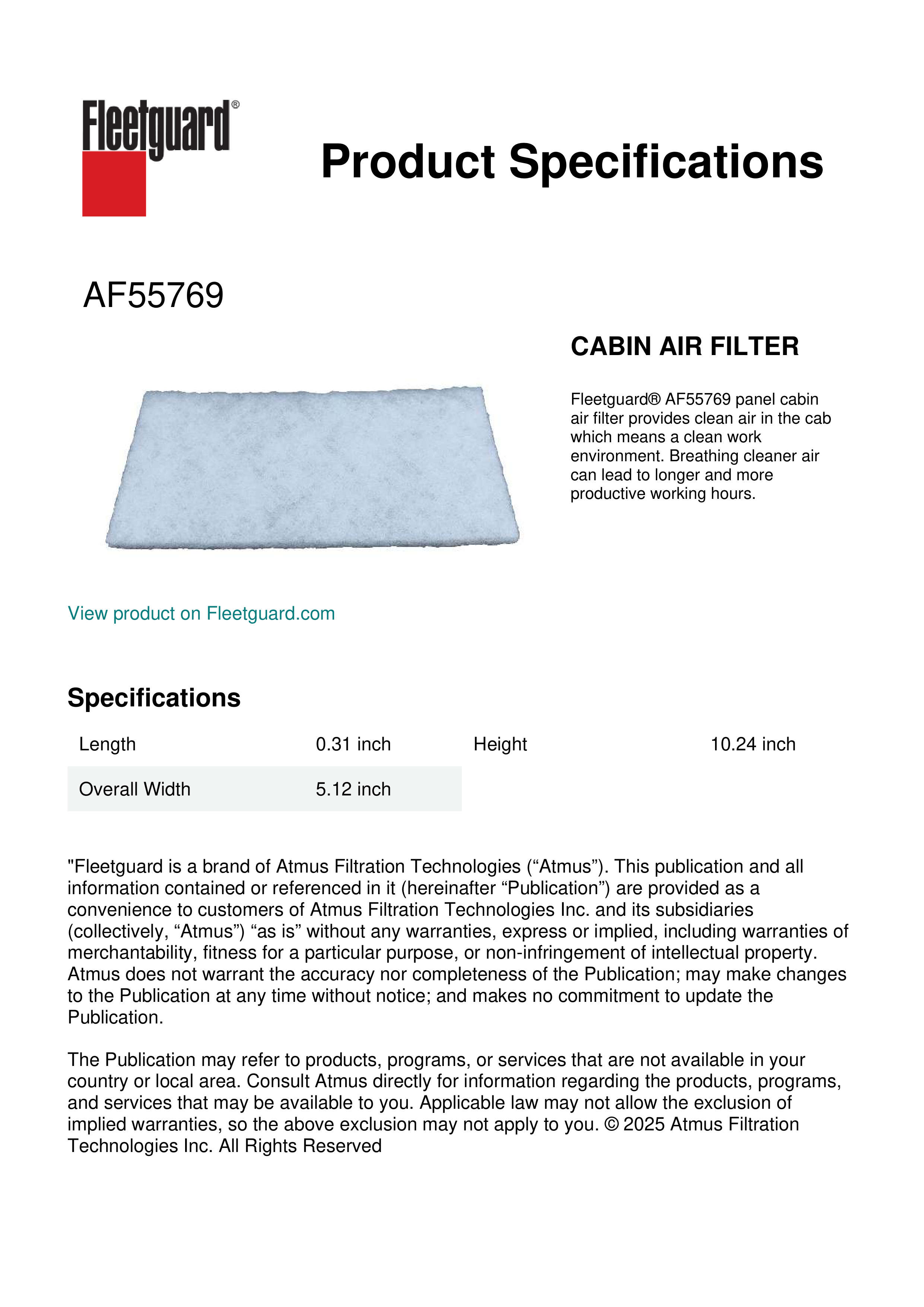 Fleetguard® AF55769 panel cabin air filter provides clean air in the cab which means a clean work environment. Breathing cleaner air can lead to longer and more productive working hours.Specification