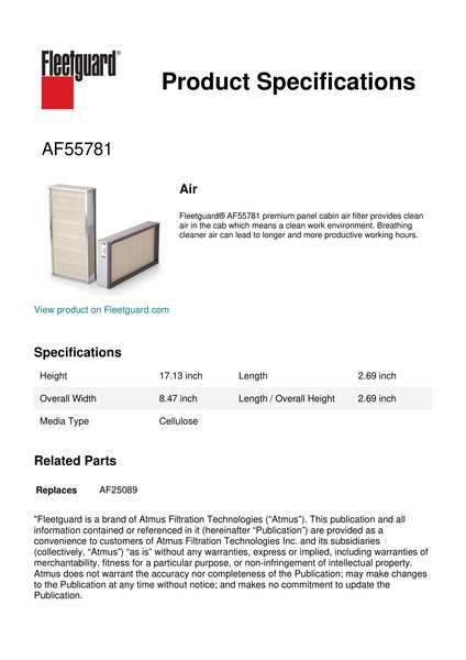 Fleetguard® AF55781 premium panel cabin air filter provides clean air in the cab which means a clean work environment. Breathing cleaner air can lead to longer and more productive working hours.Specification