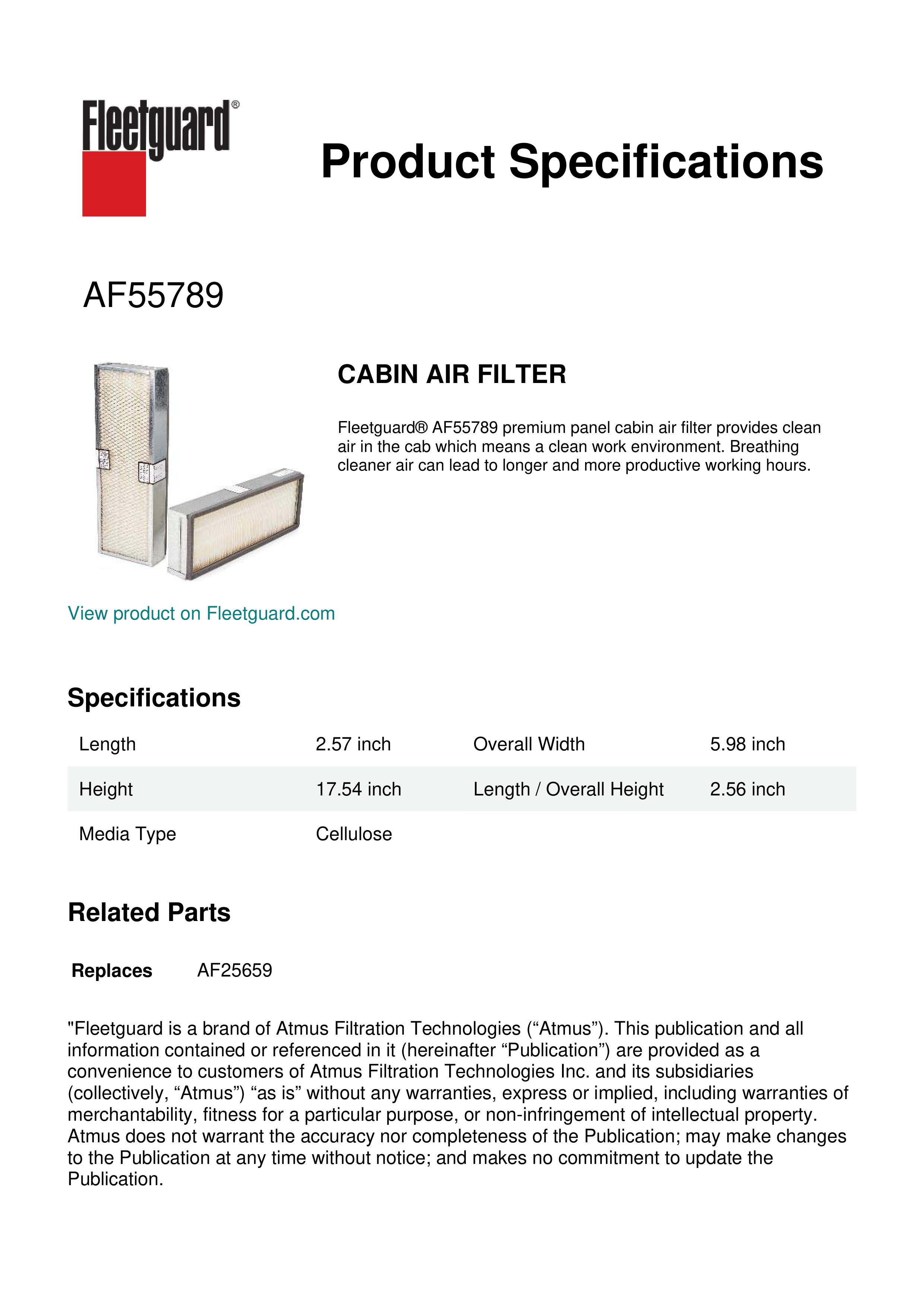 Fleetguard® AF55789 premium panel cabin air filter provides clean air in the cab which means a clean work environment. Breathing cleaner air can lead to longer and more productive working hours.Specification