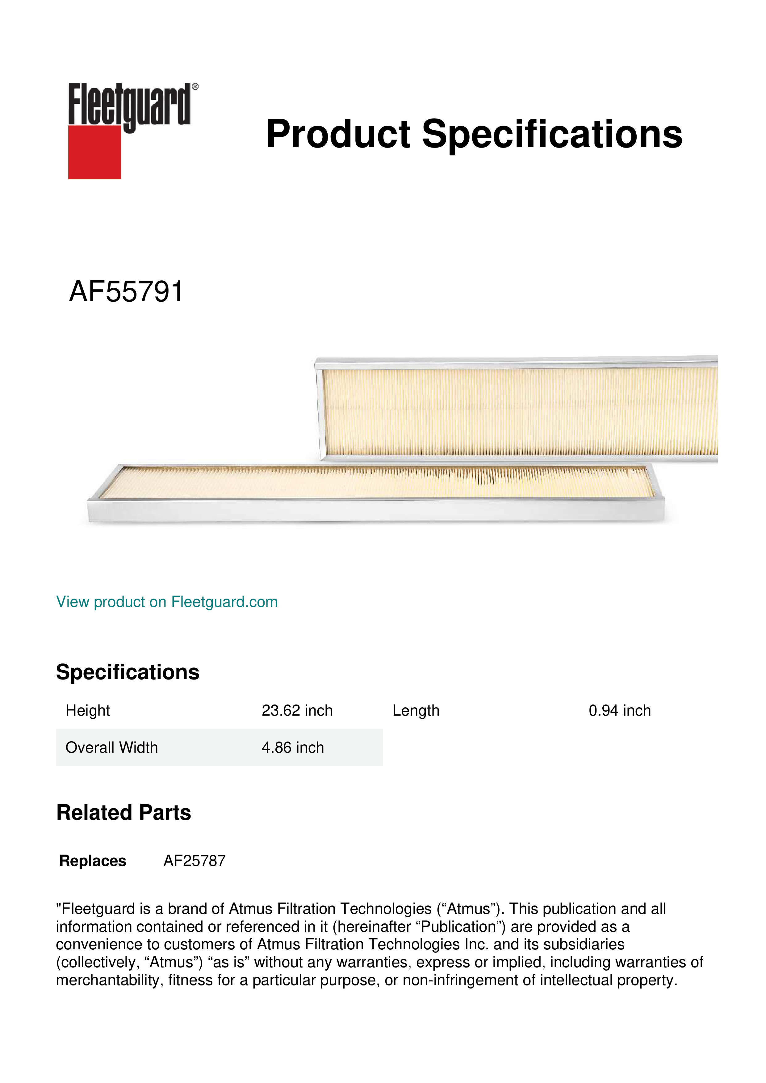 Fleetguard® AF55791 panel cabin air filter provides clean air in the cab which means a clean work environment. Breathing cleaner air can lead to longer and more productive working hours.Specification