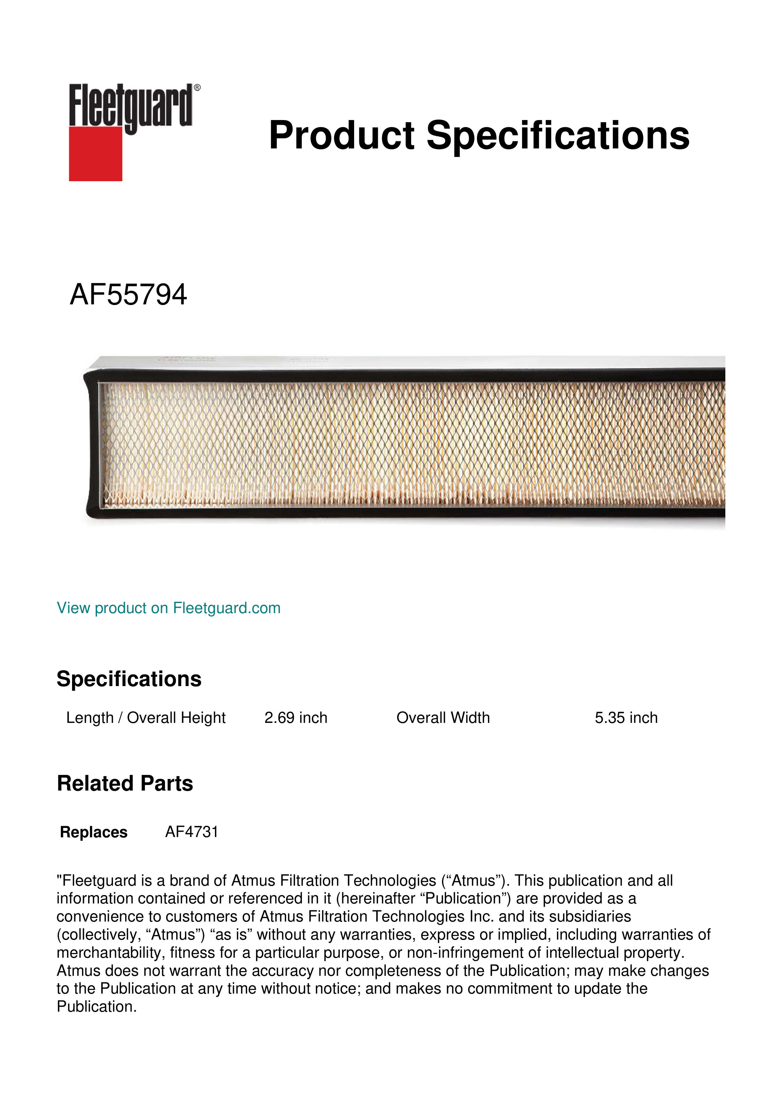 Fleetguard® AF55794 panel cabin air filter provides clean air in the cab which means a clean work environment. Breathing cleaner air can lead to longer and more productive working hours.Specification
