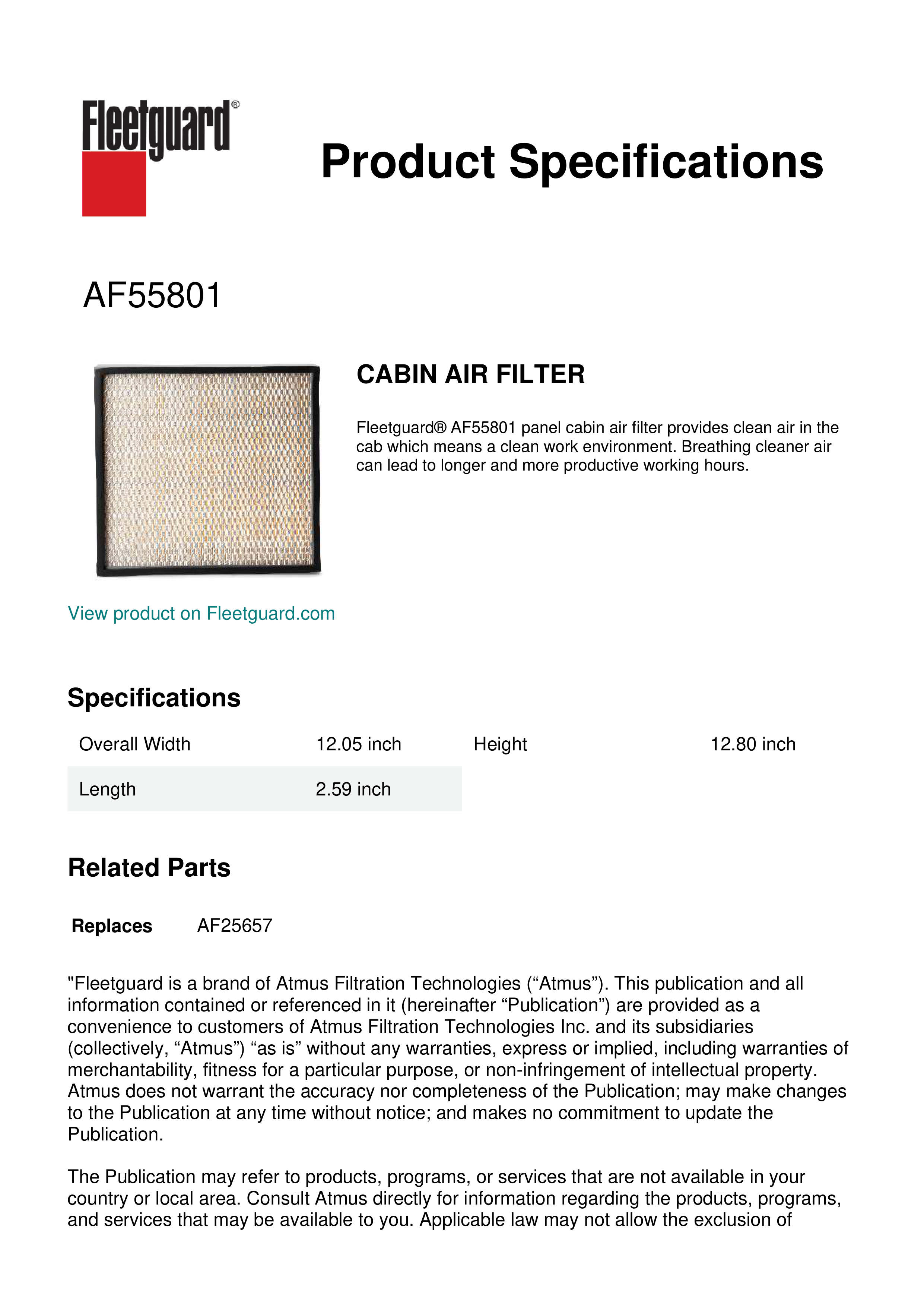Fleetguard® AF55801 panel cabin air filter provides clean air in the cab which means a clean work environment. Breathing cleaner air can lead to longer and more productive working hours.Specification