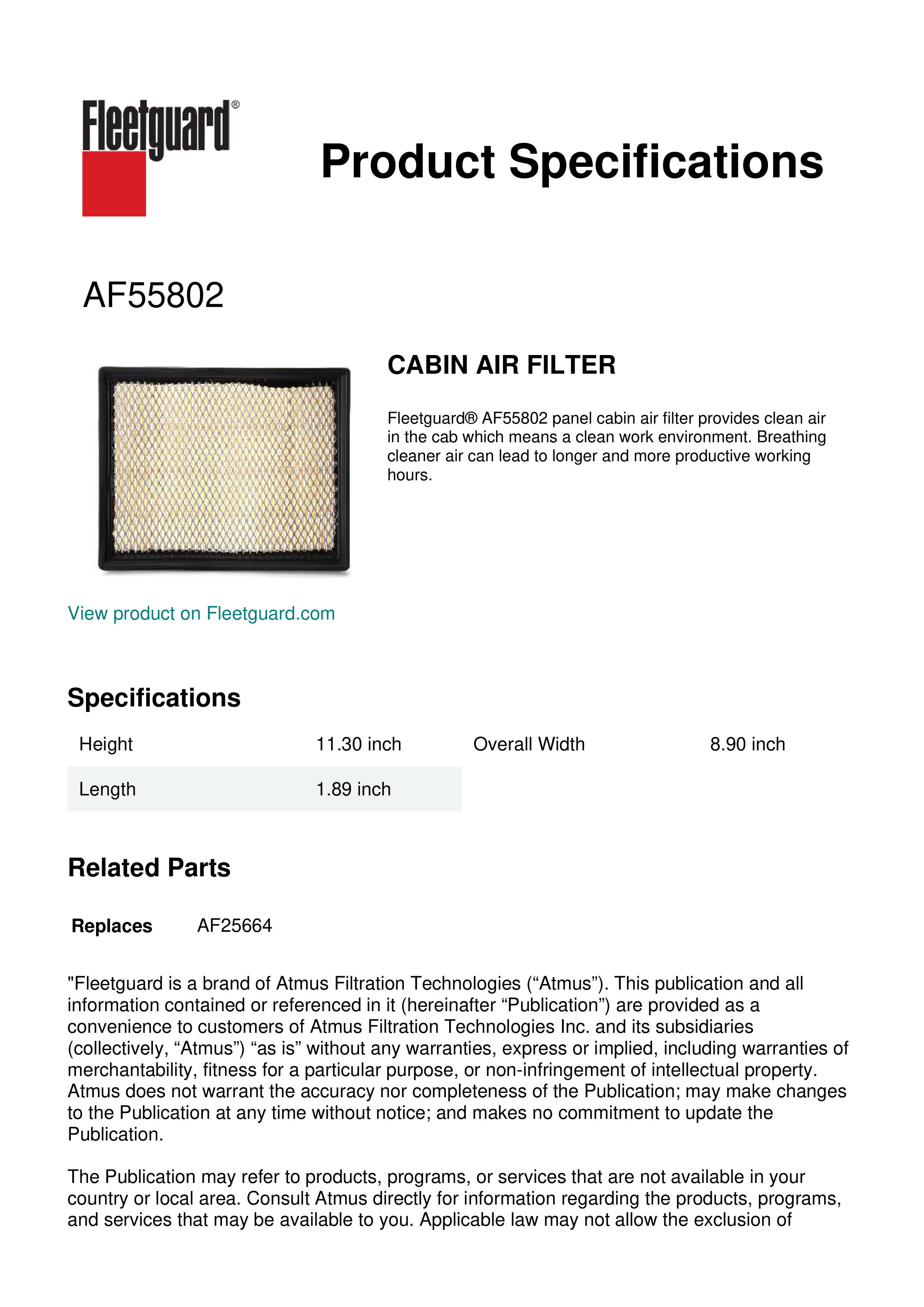 Fleetguard® AF55802 panel cabin air filter provides clean air in the cab which means a clean work environment. Breathing cleaner air can lead to longer and more productive working hours.Specification
