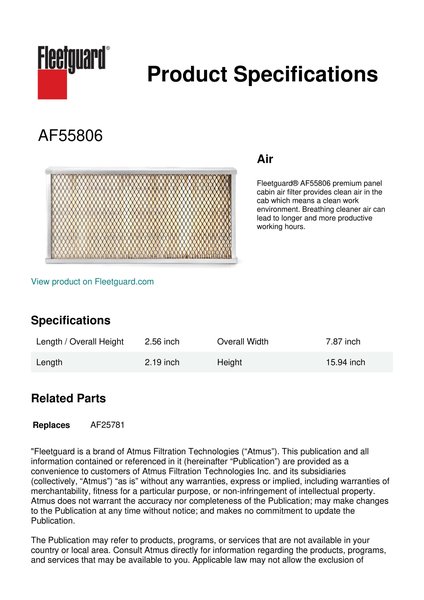 Fleetguard® AF55806 premium panel cabin air filter provides clean air in the cab which means a clean work environment. Breathing cleaner air can lead to longer and more productive working hours.Specification