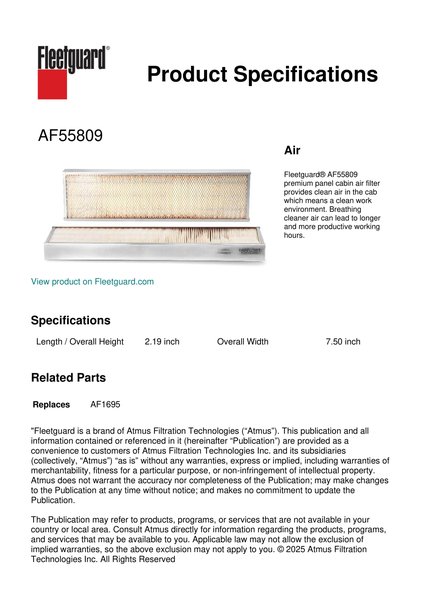 Fleetguard® AF55809 premium panel cabin air filter provides clean air in the cab which means a clean work environment. Breathing cleaner air can lead to longer and more productive working hours.Specification