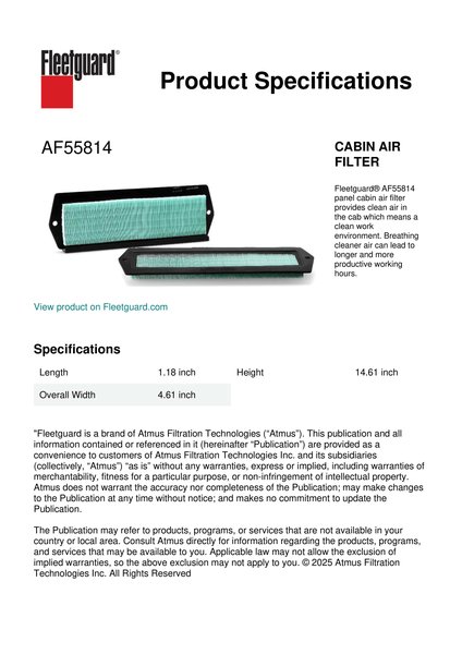 Fleetguard® AF55814 panel cabin air filter provides clean air in the cab which means a clean work environment. Breathing cleaner air can lead to longer and more productive working hours.Specification
