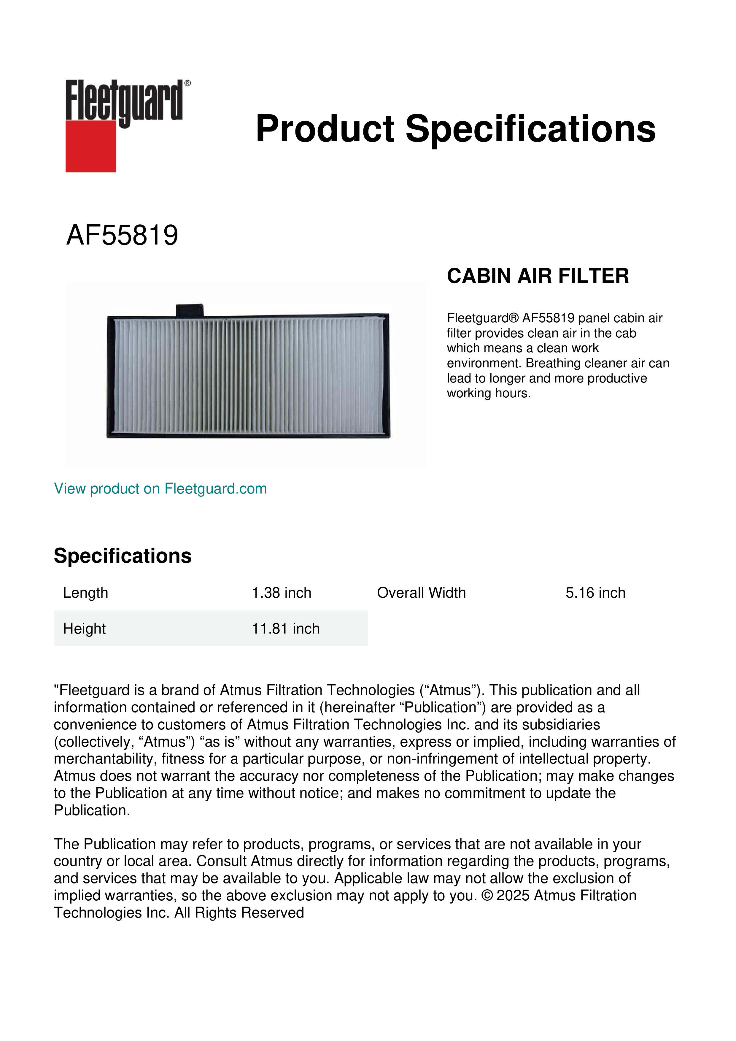 Fleetguard® AF55819 panel cabin air filter provides clean air in the cab which means a clean work environment. Breathing cleaner air can lead to longer and more productive working hours.Specification