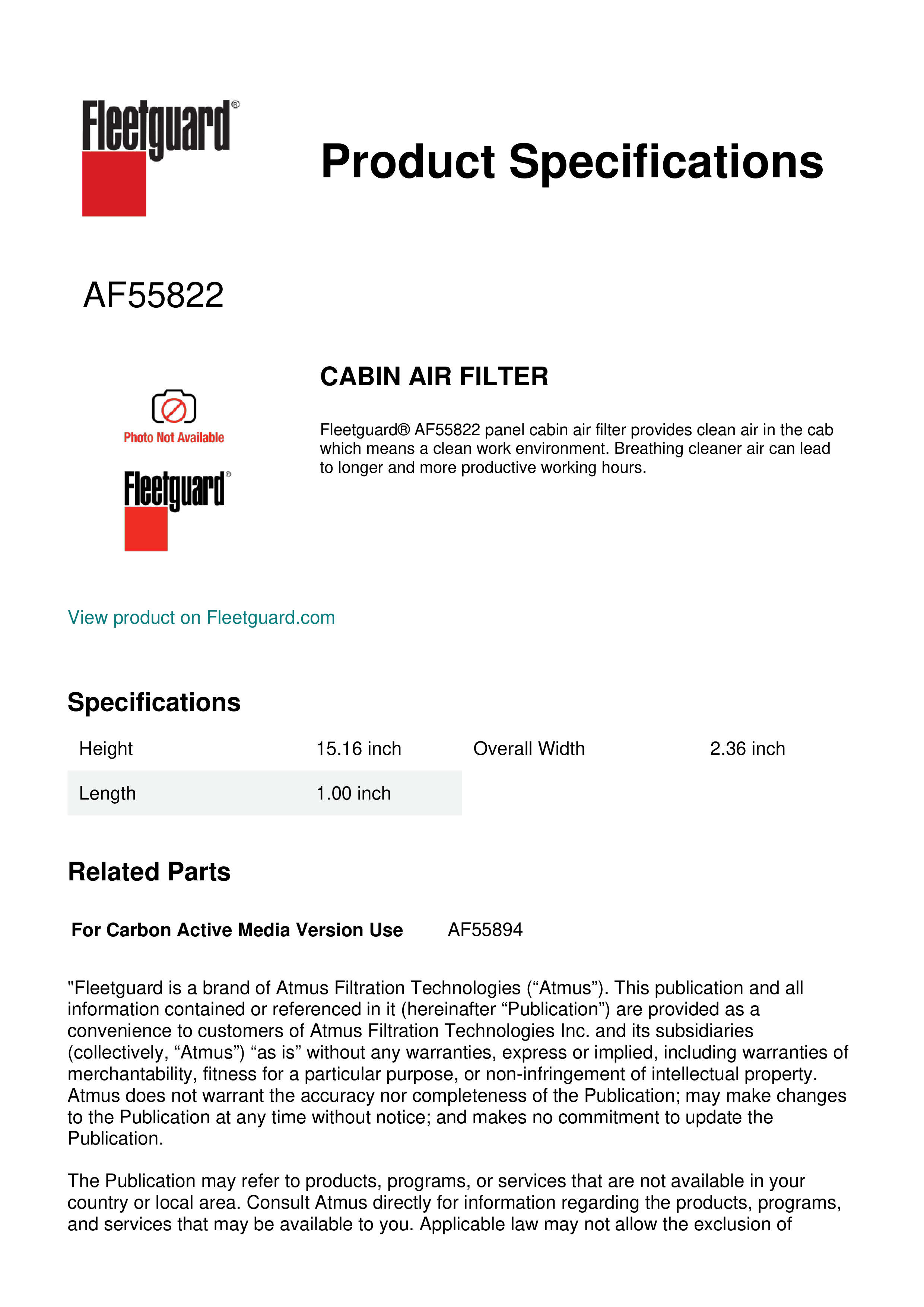Fleetguard® AF55822 panel cabin air filter provides clean air in the cab which means a clean work environment. Breathing cleaner air can lead to longer and more productive working hours.Specification