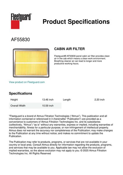 Fleetguard® AF55830 panel cabin air filter provides clean air in the cab which means a clean work environment. Breathing cleaner air can lead to longer and more productive working hours.Specification