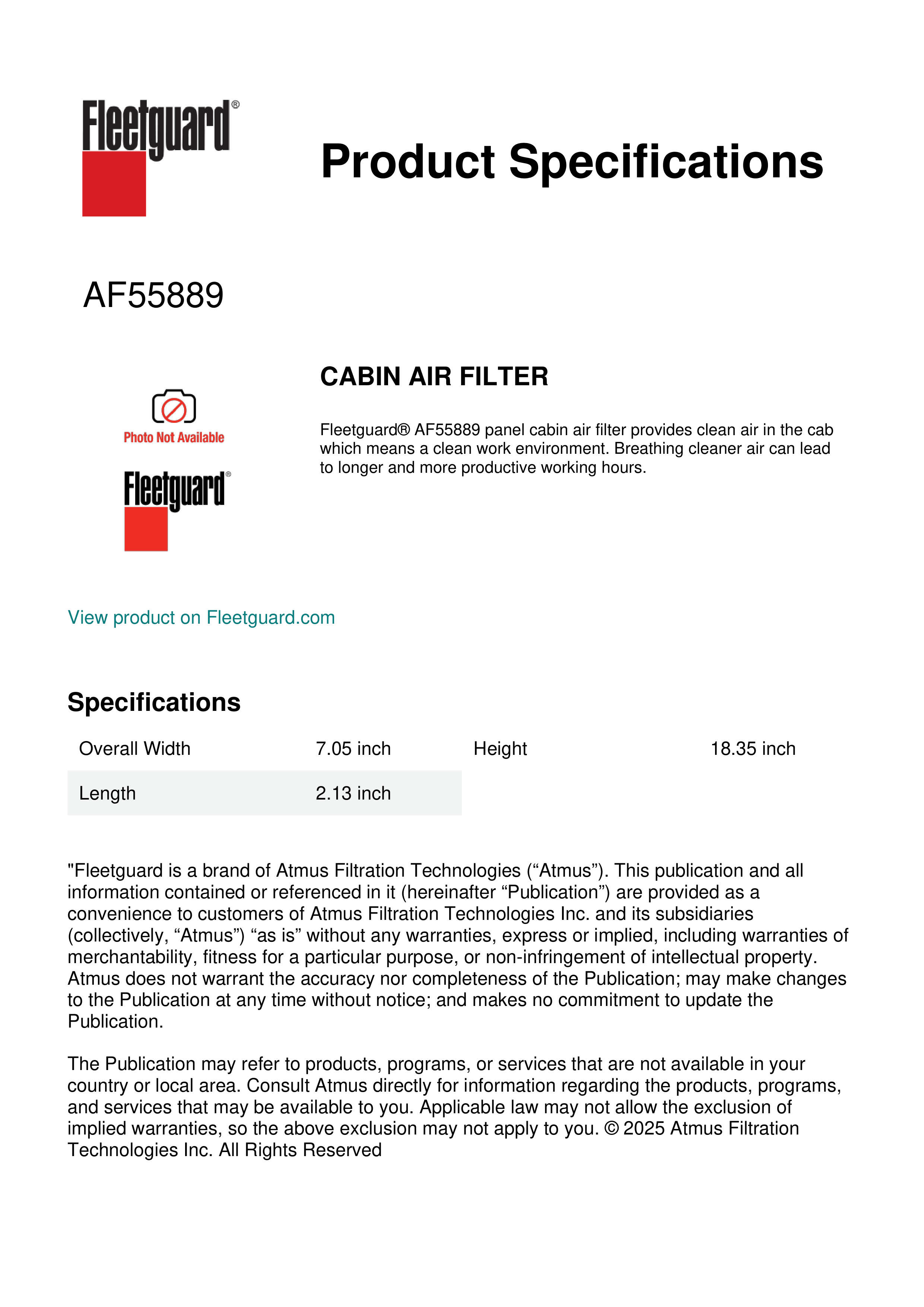 Fleetguard® AF55889 panel cabin air filter provides clean air in the cab which means a clean work environment. Breathing cleaner air can lead to longer and more productive working hours.Specification