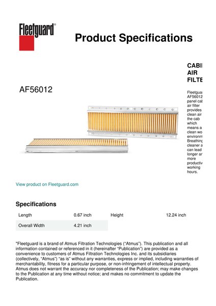 Fleetguard® AF56012 panel cabin air filter provides clean air in the cab which means a clean work environment. Breathing cleaner air can lead to longer and more productive working hours.Specification
