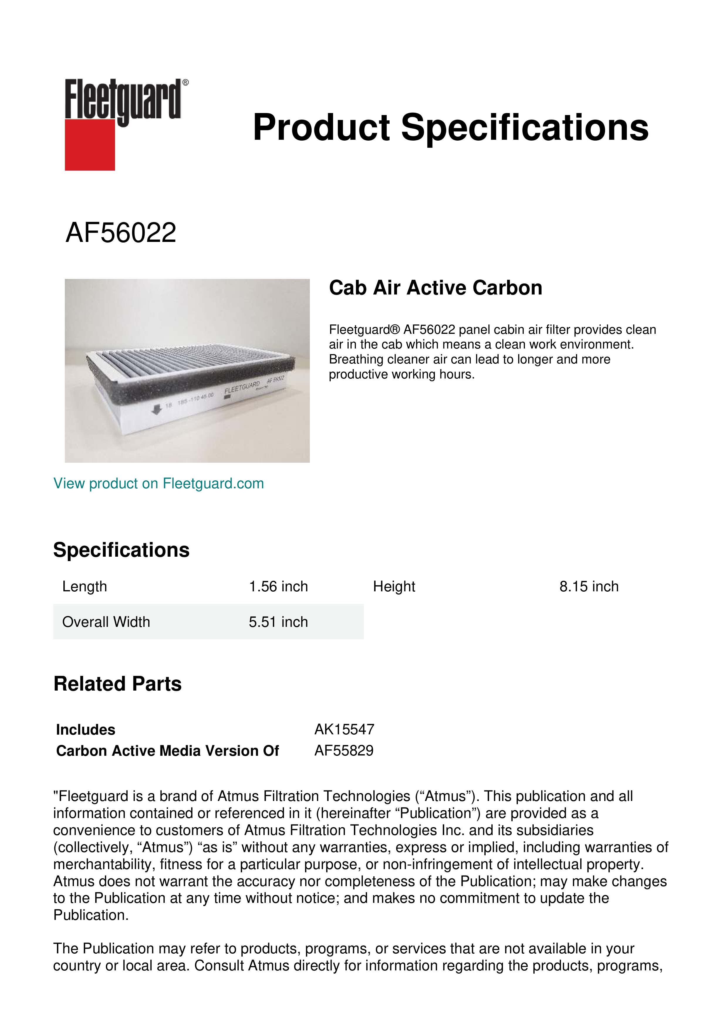 Fleetguard AF56022 Replacement Cab Air Active Carbon