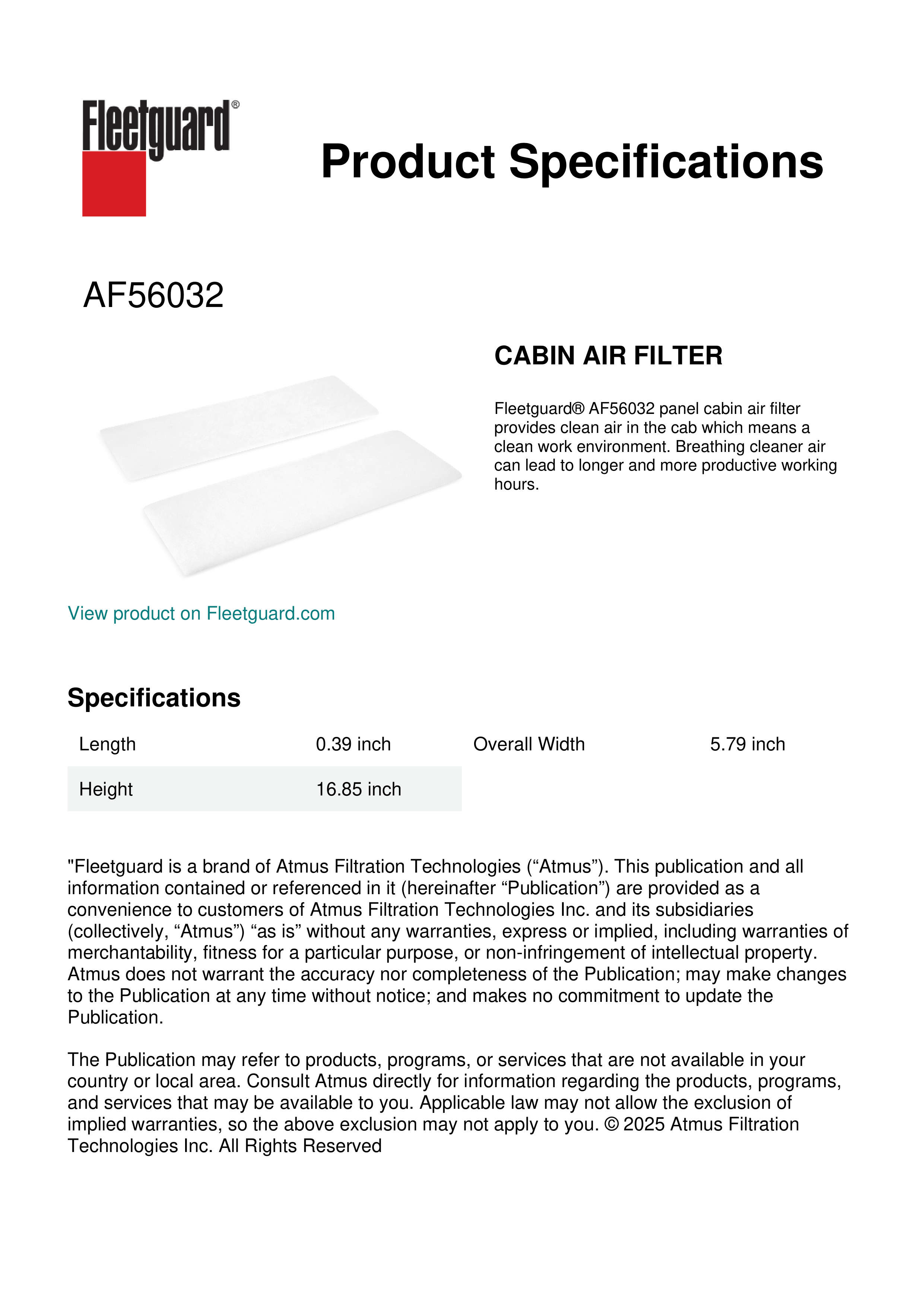 Fleetguard® AF56032 panel cabin air filter provides clean air in the cab which means a clean work environment. Breathing cleaner air can lead to longer and more productive working hours.Specification
