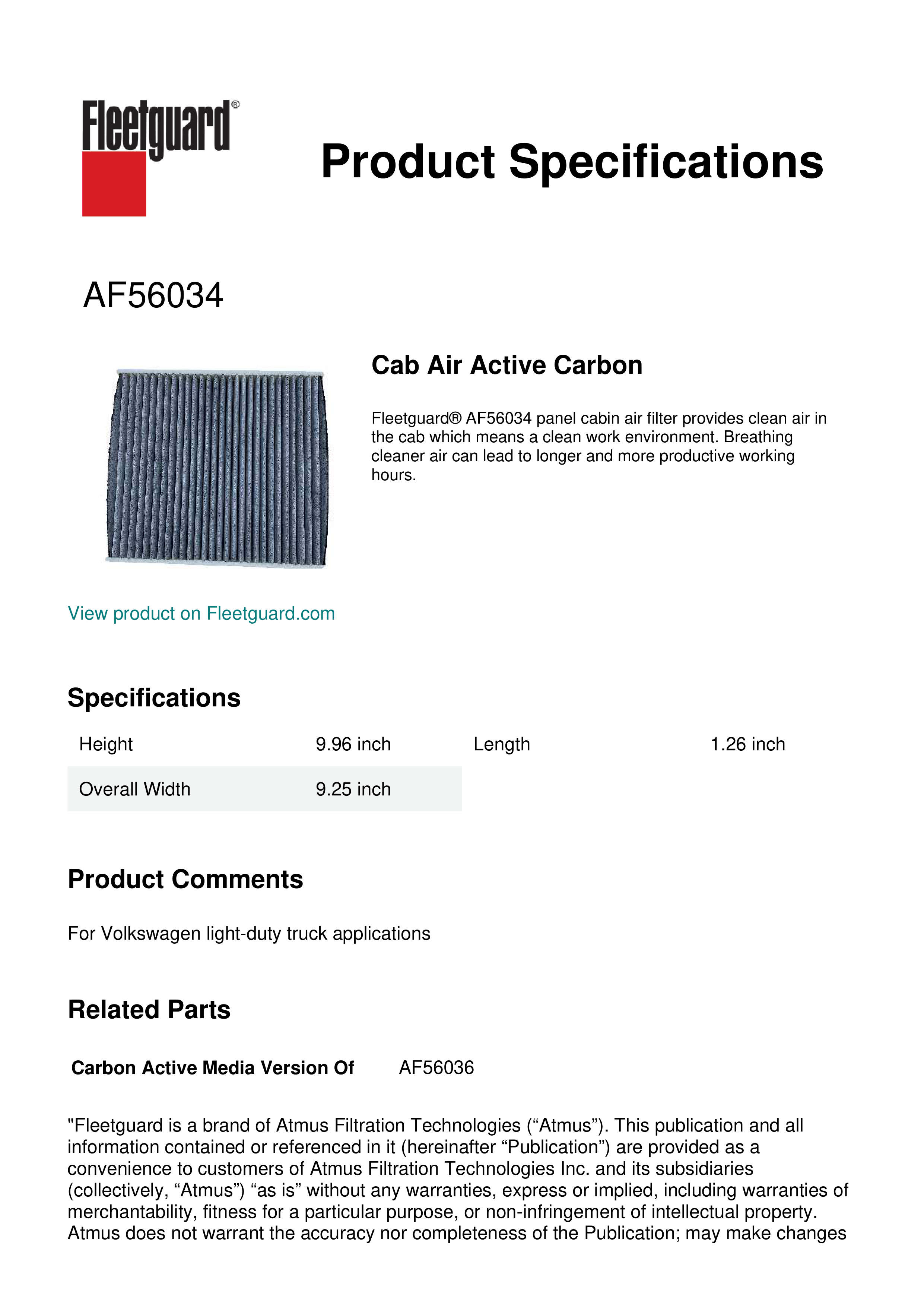 Fleetguard® AF56034 panel cabin air filter provides clean air in the cab which means a clean work environment. Breathing cleaner air can lead to longer and more productive working hours.Specification