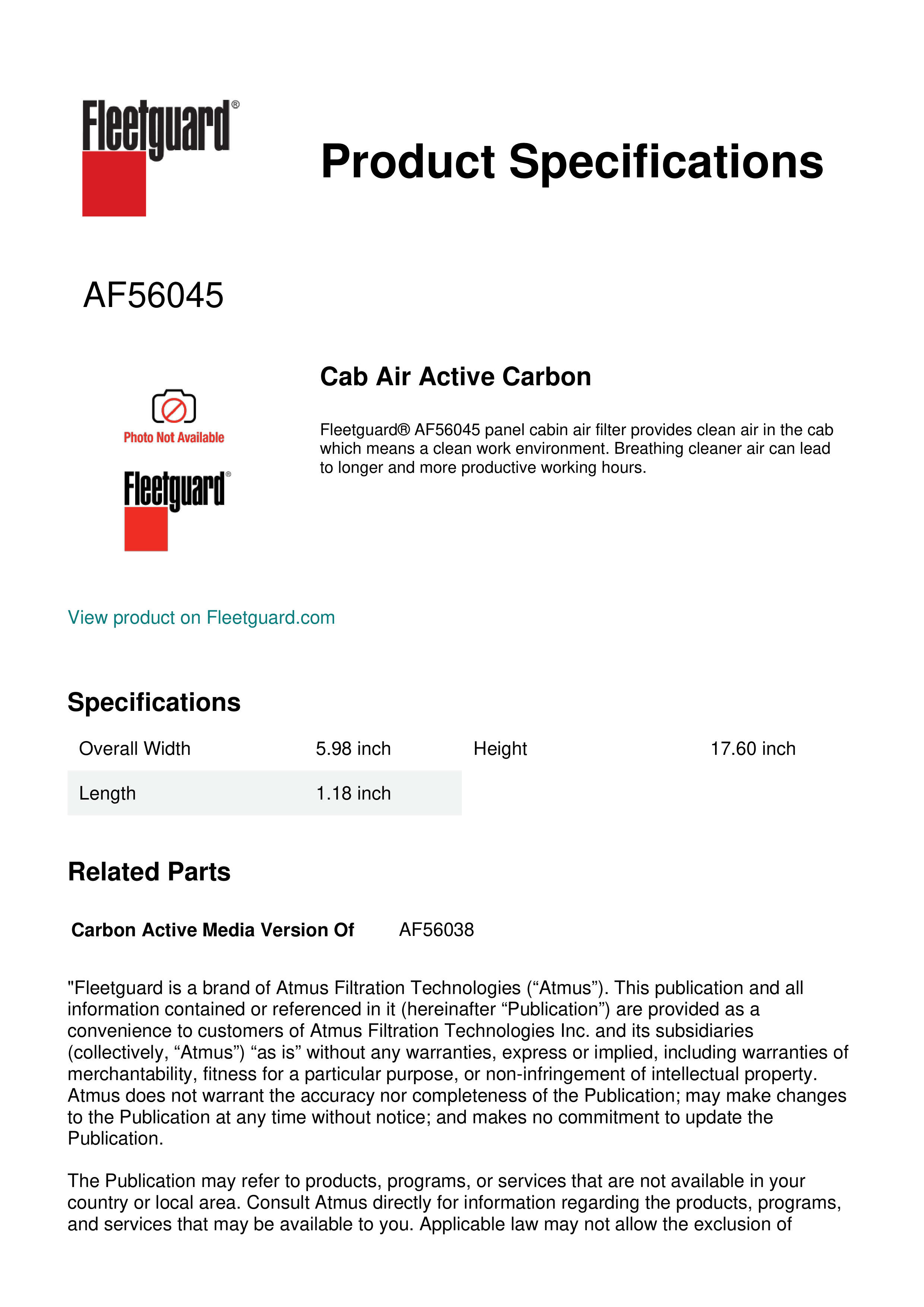 Fleetguard® AF56045 panel cabin air filter provides clean air in the cab which means a clean work environment. Breathing cleaner air can lead to longer and more productive working hours.Specification