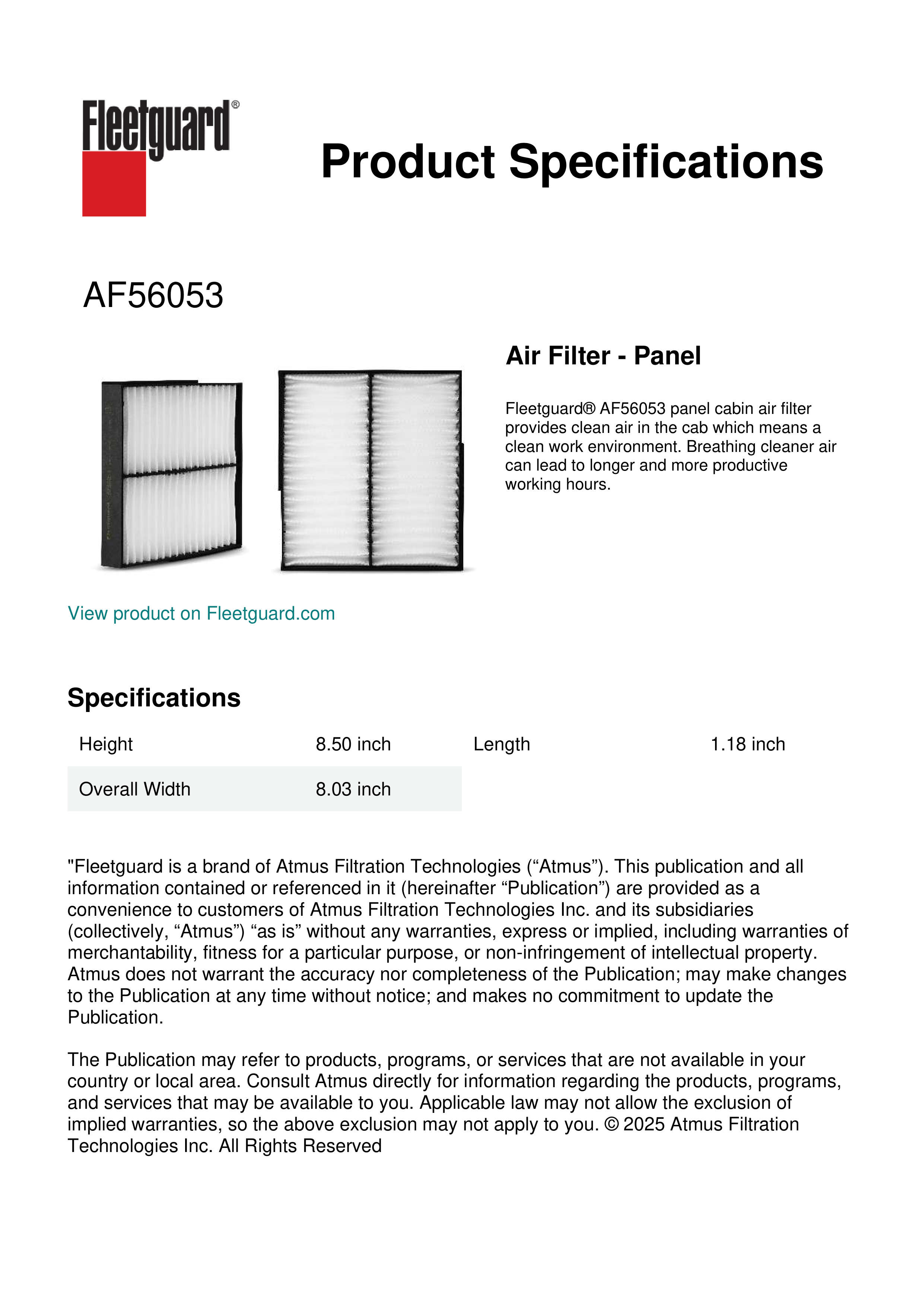 Fleetguard® AF56053 panel cabin air filter provides clean air in the cab which means a clean work environment. Breathing cleaner air can lead to longer and more productive working hours.Specification