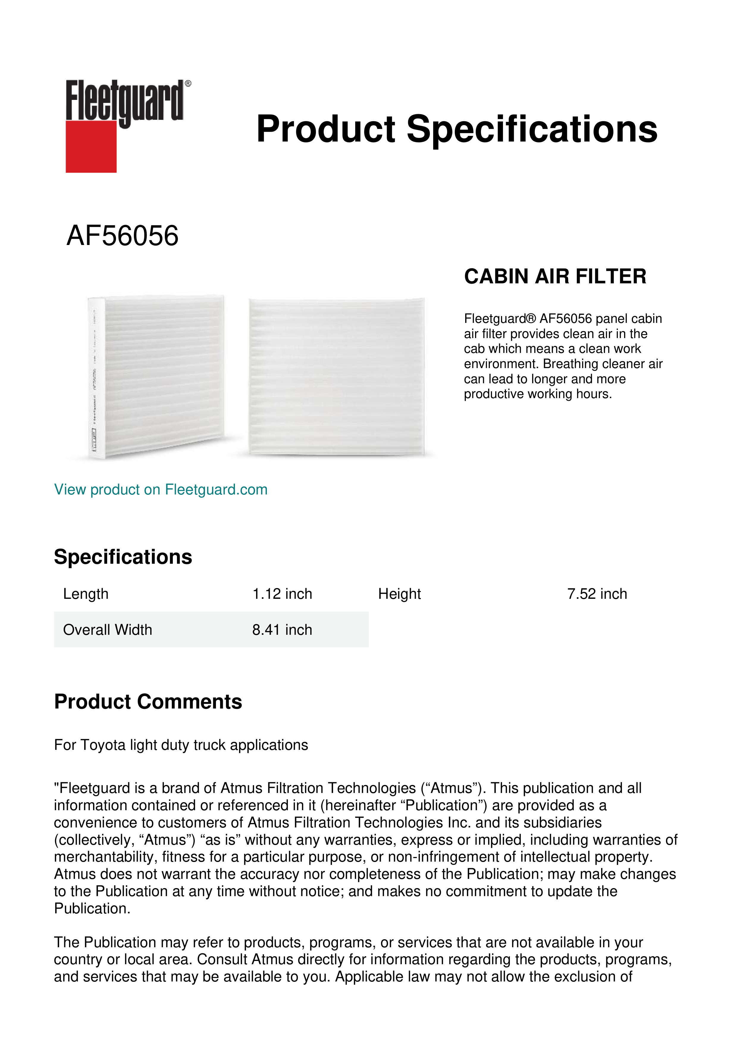 Fleetguard AF56056 Replacement Cabin Air Filter