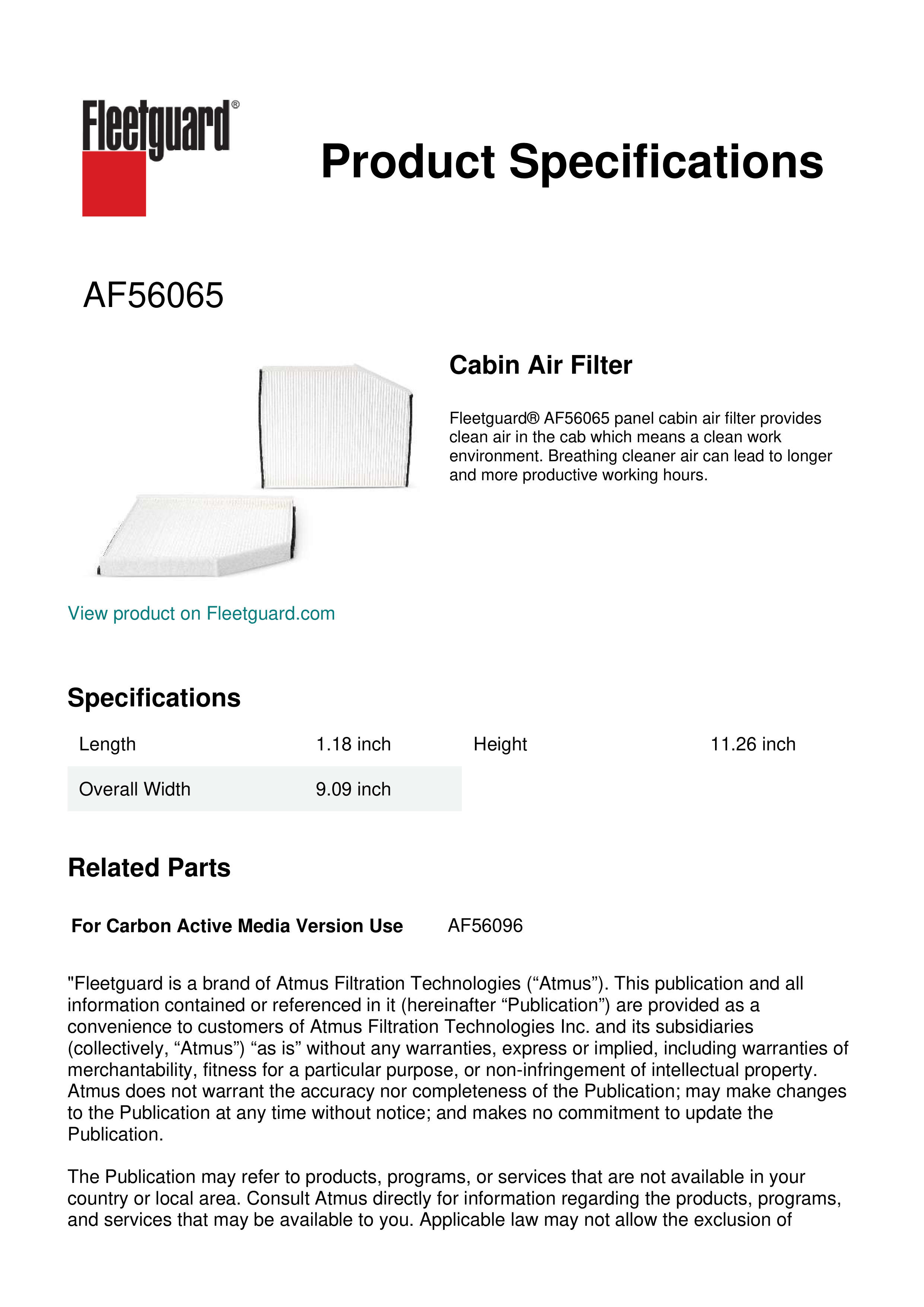 Fleetguard® AF56065 panel cabin air filter provides clean air in the cab which means a clean work environment. Breathing cleaner air can lead to longer and more productive working hours.Specification