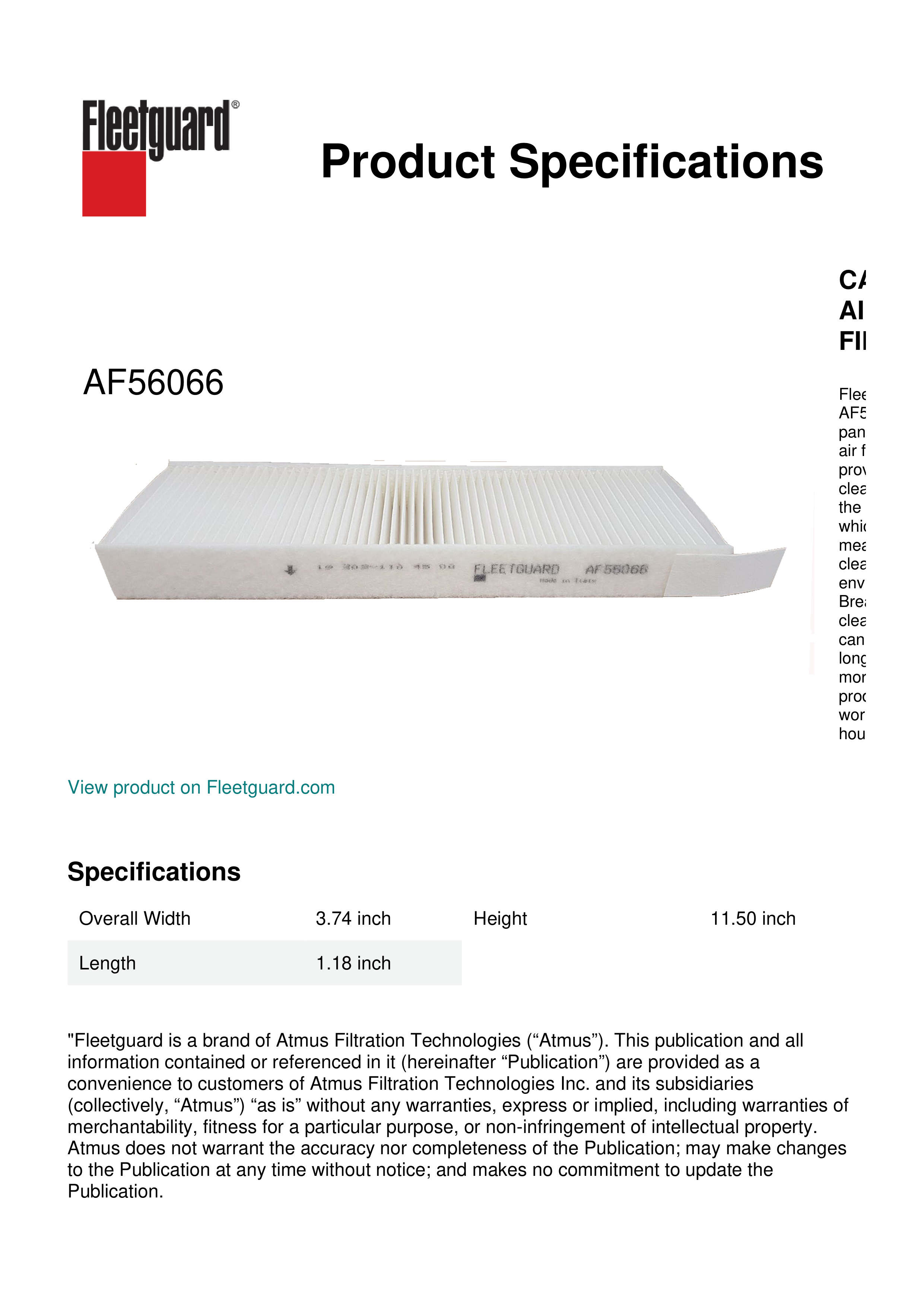 Fleetguard® AF56066 panel cabin air filter provides clean air in the cab which means a clean work environment. Breathing cleaner air can lead to longer and more productive working hours.Specification