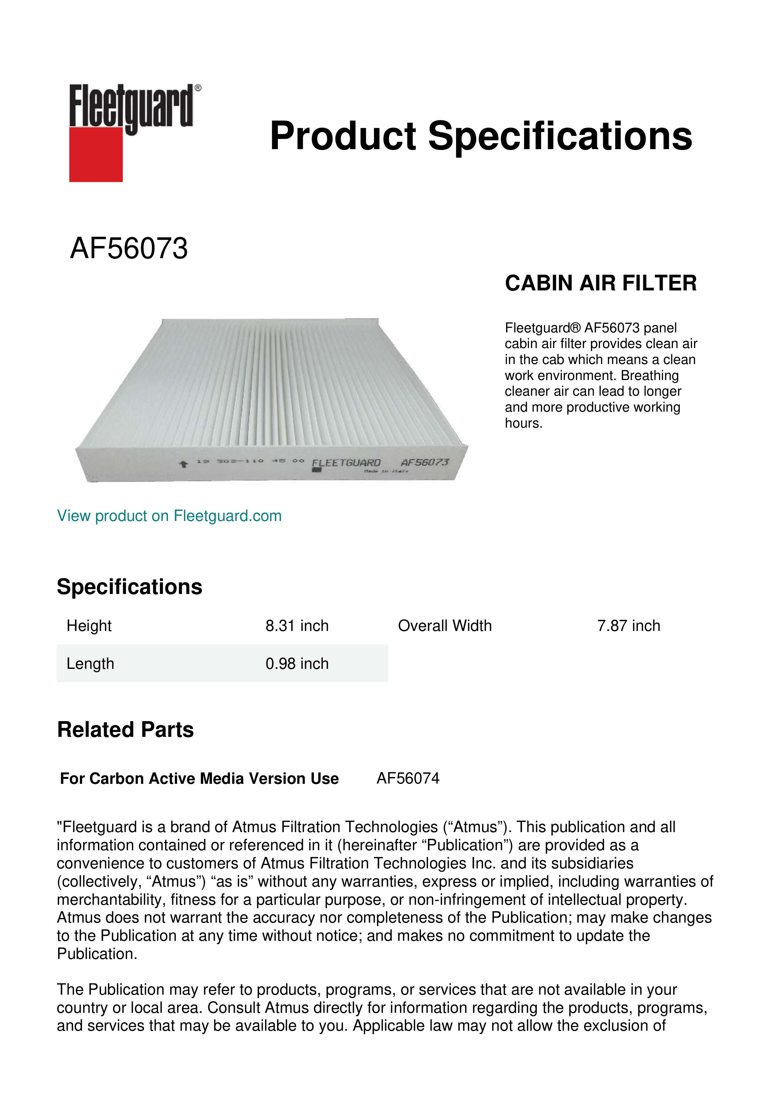 Fleetguard® AF56073 panel cabin air filter provides clean air in the cab which means a clean work environment. Breathing cleaner air can lead to longer and more productive working hours.Specification