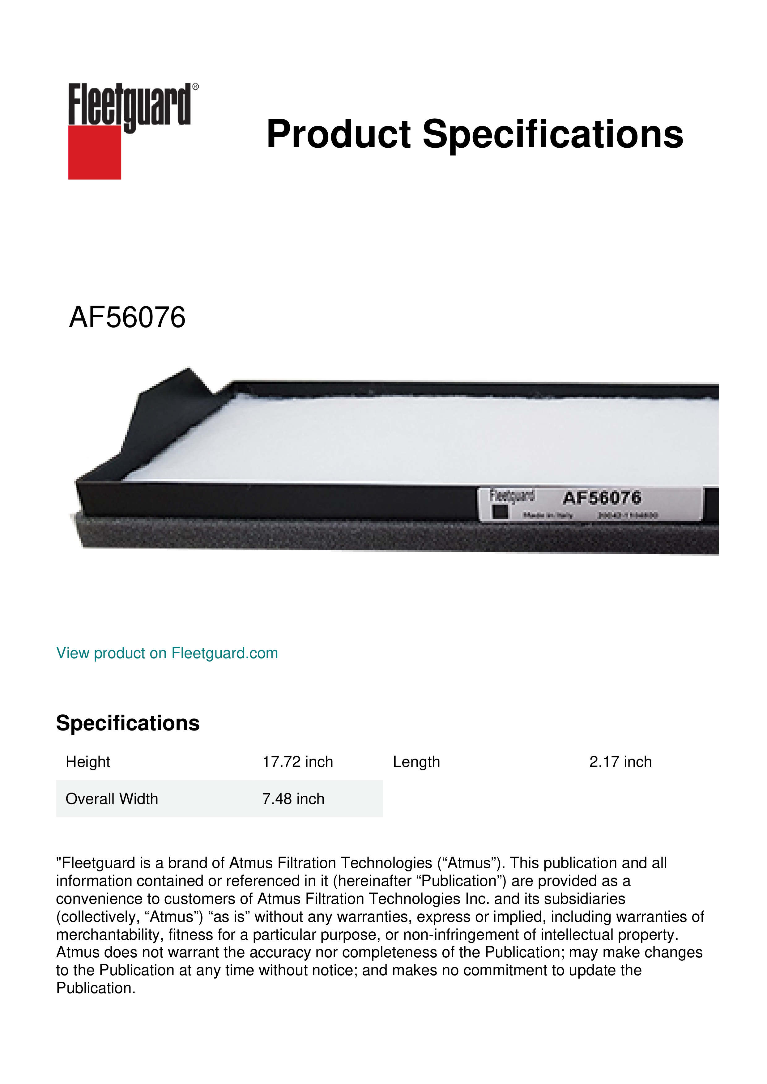 Fleetguard® AF56076 panel cabin air filter provides clean air in the cab which means a clean work environment. Breathing cleaner air can lead to longer and more productive working hours.Specification