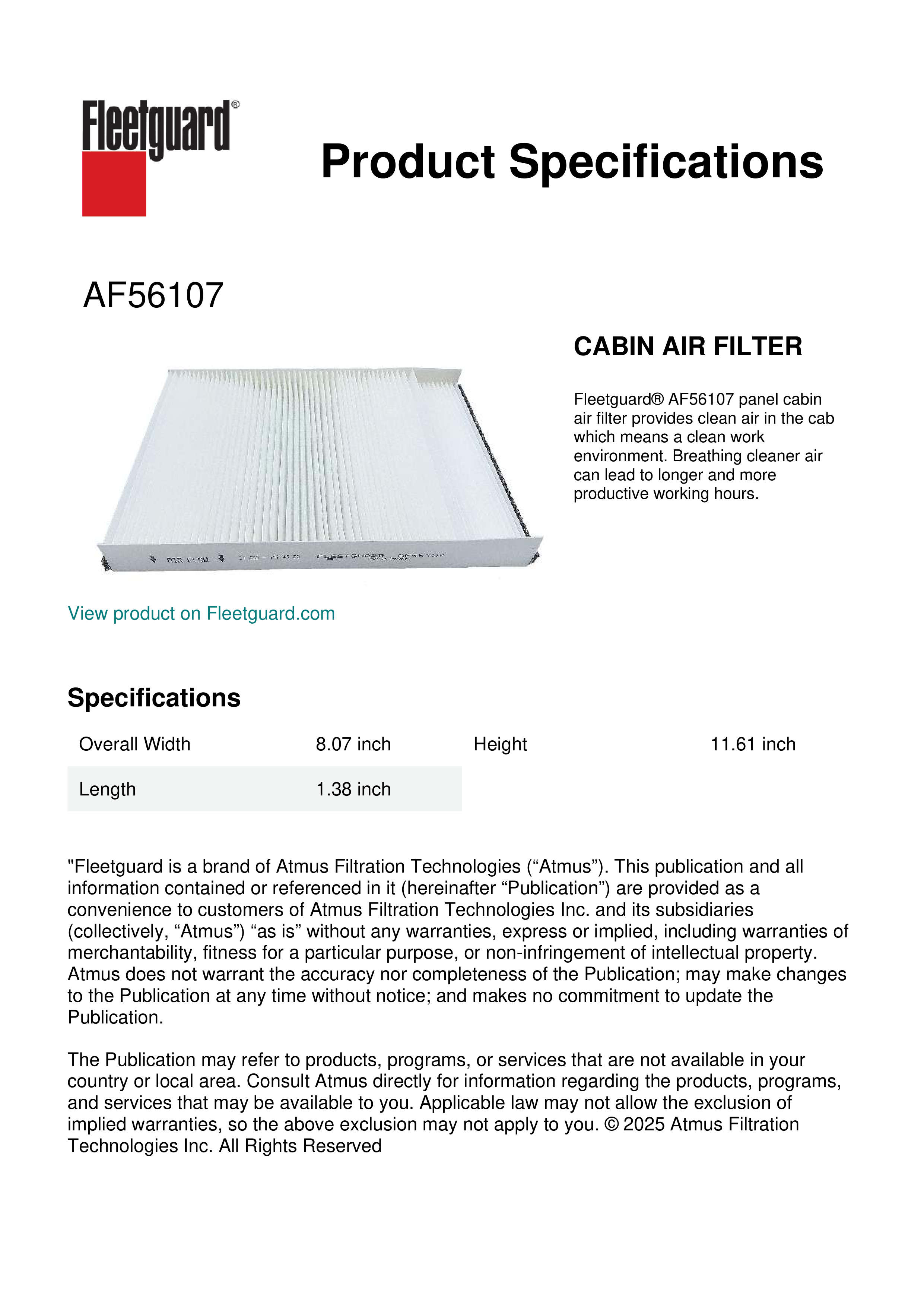 Fleetguard® AF56107 panel cabin air filter provides clean air in the cab which means a clean work environment. Breathing cleaner air can lead to longer and more productive working hours.Specification