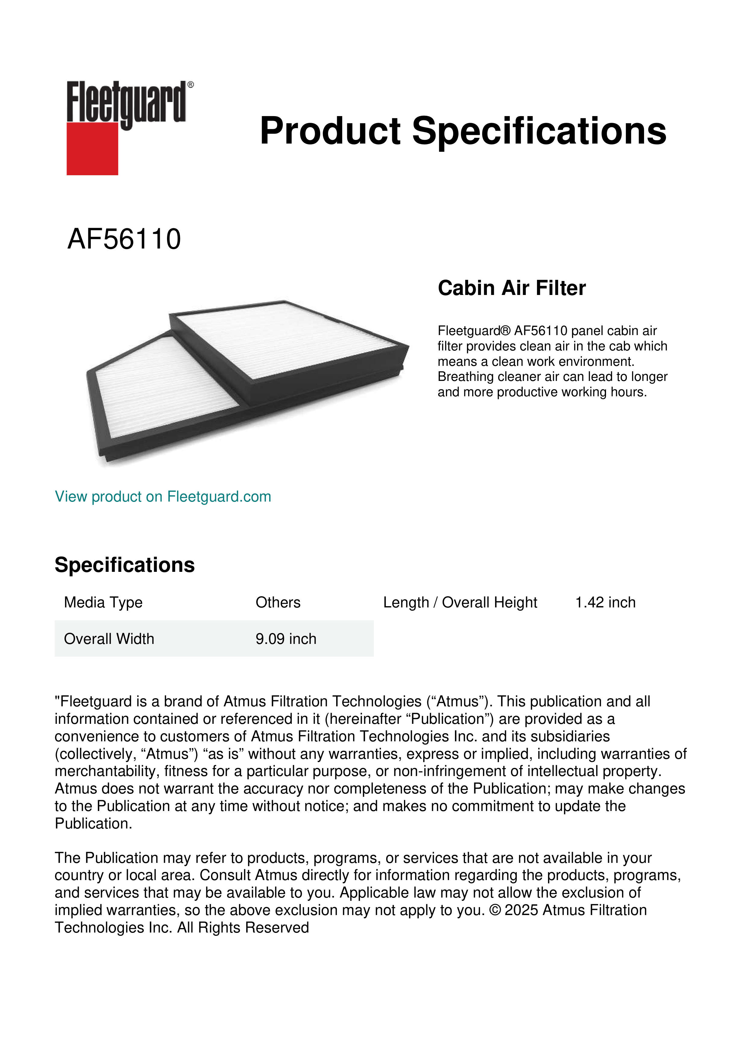 Fleetguard® AF56110 panel cabin air filter provides clean air in the cab which means a clean work environment. Breathing cleaner air can lead to longer and more productive working hours.Specification