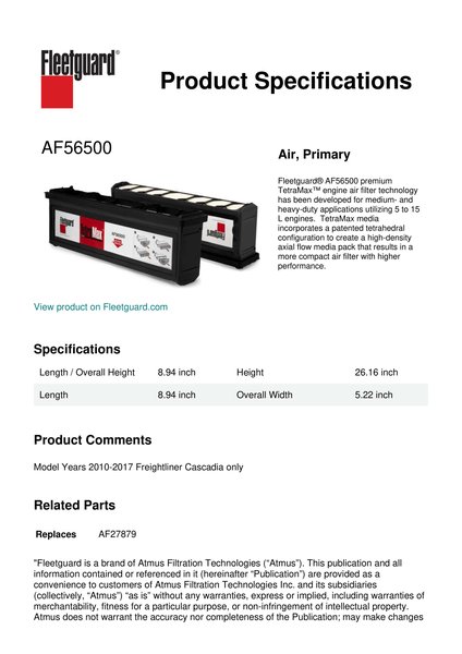 Fleetguard® AF56500 premium TetraMax™ engine air filter technology has been developed for medium- and heavy-duty applications utilizing 5 to 15 L engines. TetraMax media incorporates a patented tetrahedral configuration to create a high-density axial flow media pack that results in a more compact air filter with higher performance.Specification