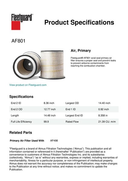 Fleetguard® AF801 axial seal primary air filter ensures a proper seal and prevent leaks to prevent airborne contaminants from reaching the combustion chamber.Specification