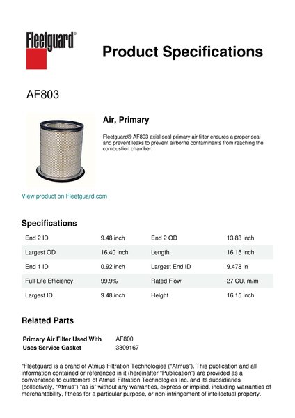 Fleetguard AF803 Air, Primary