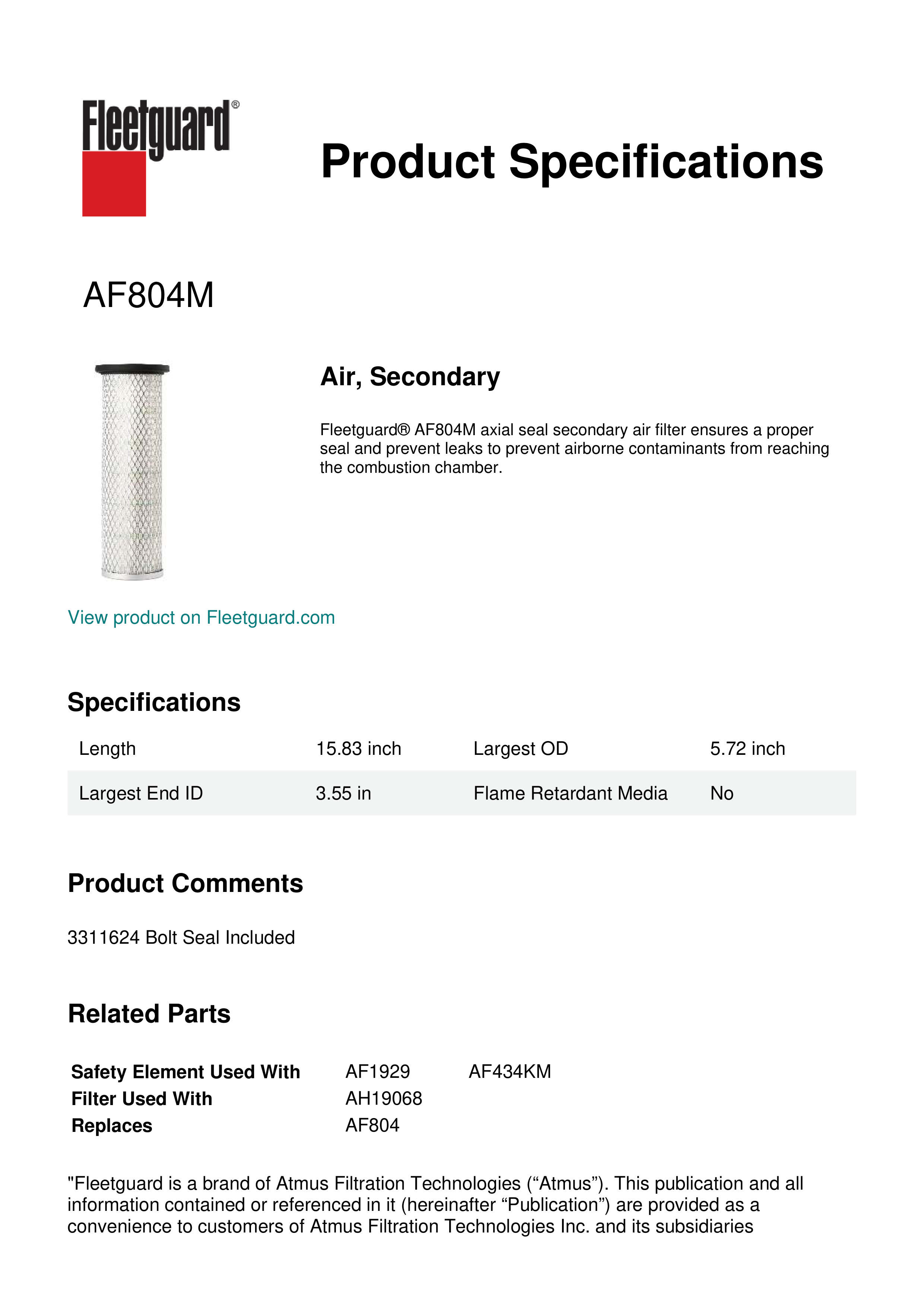 Fleetguard AF804M Air, Secondary
