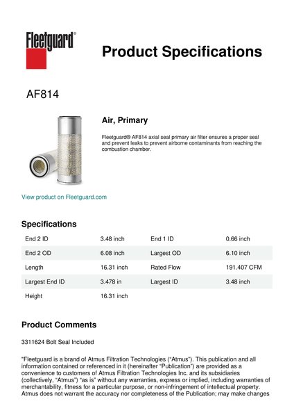 Fleetguard® AF814 axial seal primary air filter ensures a proper seal and prevent leaks to prevent airborne contaminants from reaching the combustion chamber.