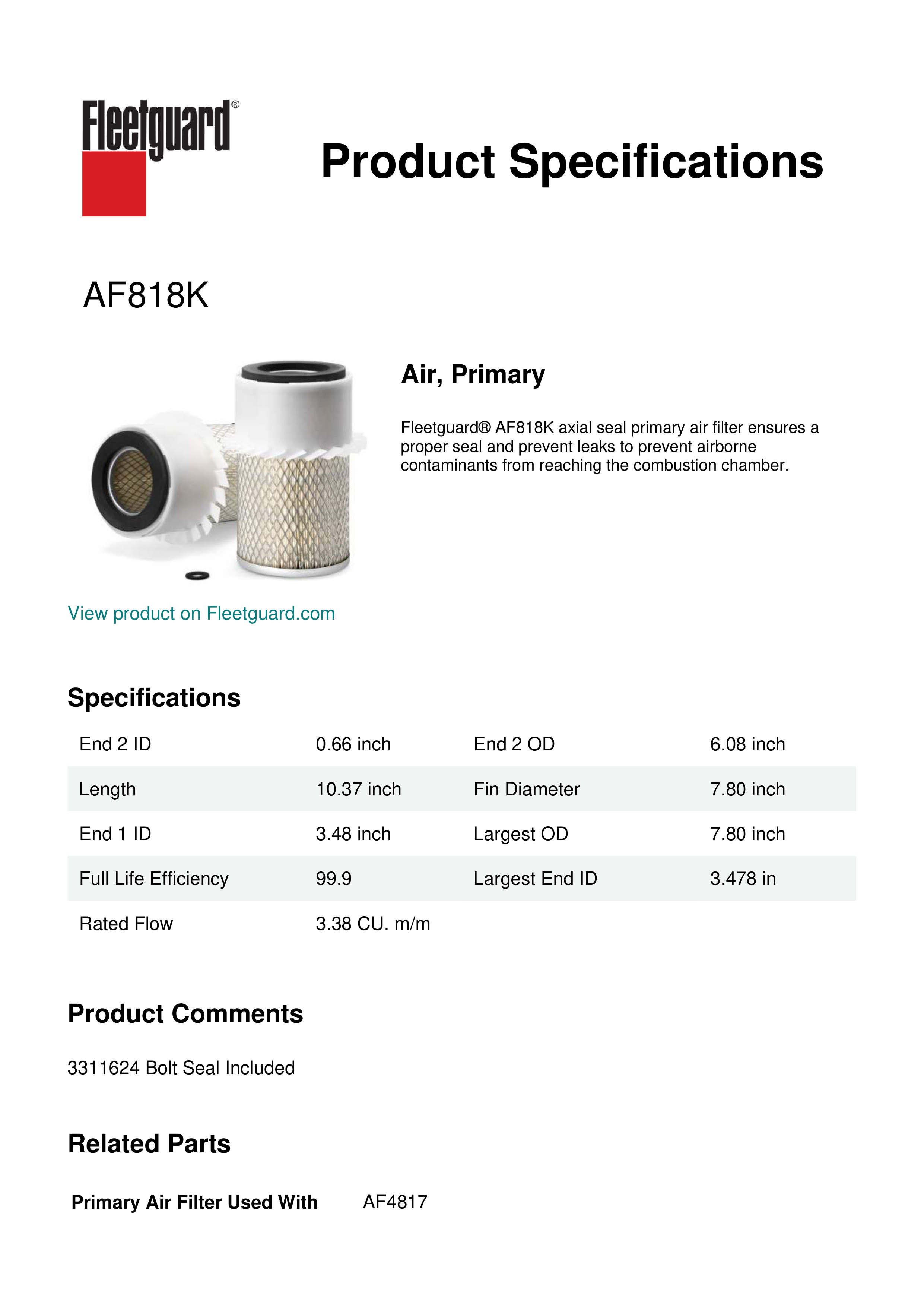 Fleetguard® AF818K axial seal primary air filter ensures a proper seal and prevent leaks to prevent airborne contaminants from reaching the combustion chamber.