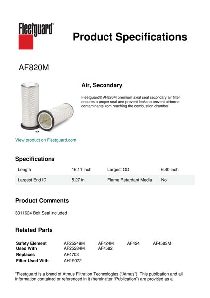 Fleetguard® AF820M premium axial seal secondary air filter ensures a proper seal and prevent leaks to prevent airborne contaminants from reaching the combustion chamber.Specification