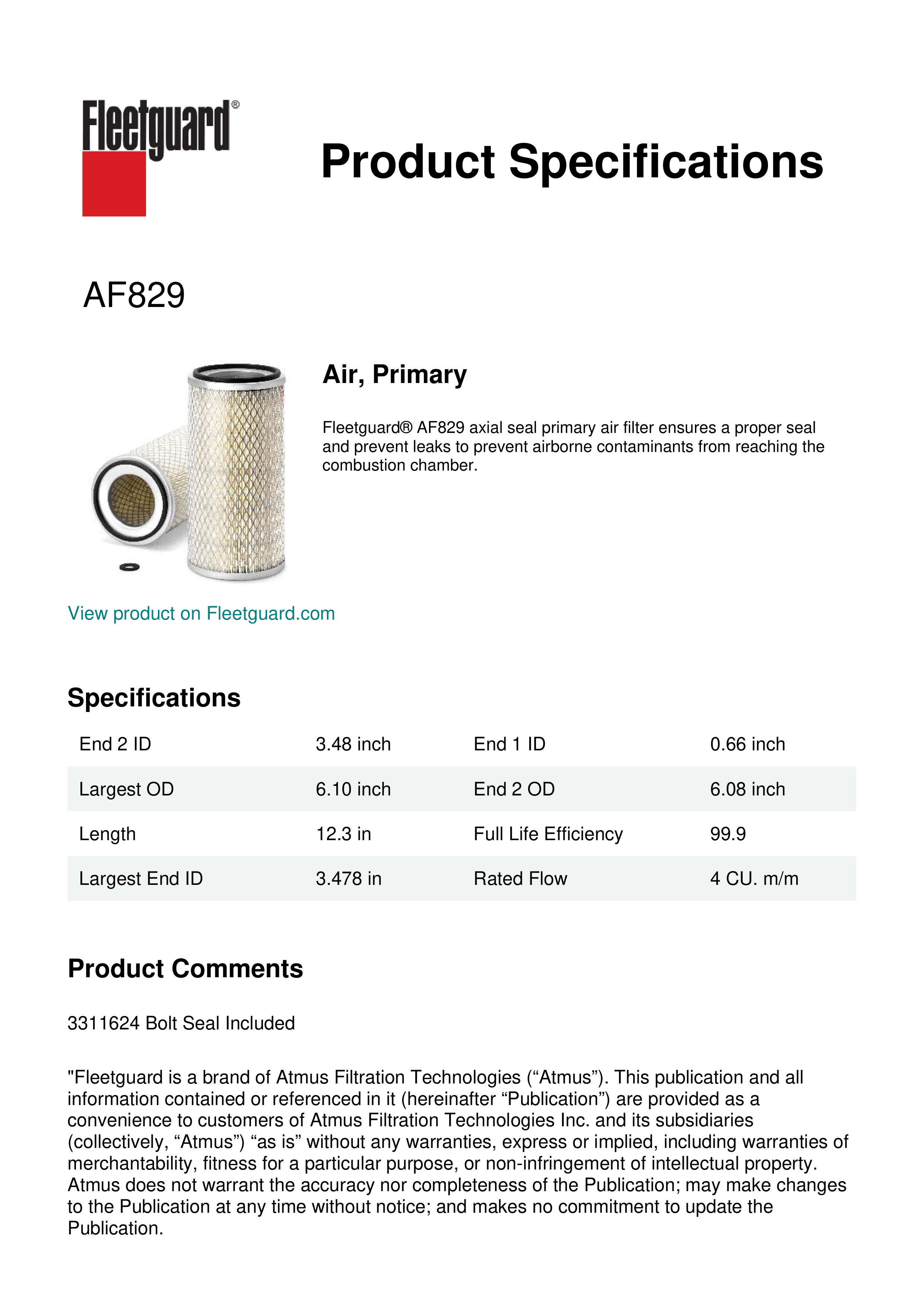 Fleetguard® AF829 axial seal primary air filter ensures a proper seal and prevent leaks to prevent airborne contaminants from reaching the combustion chamber.