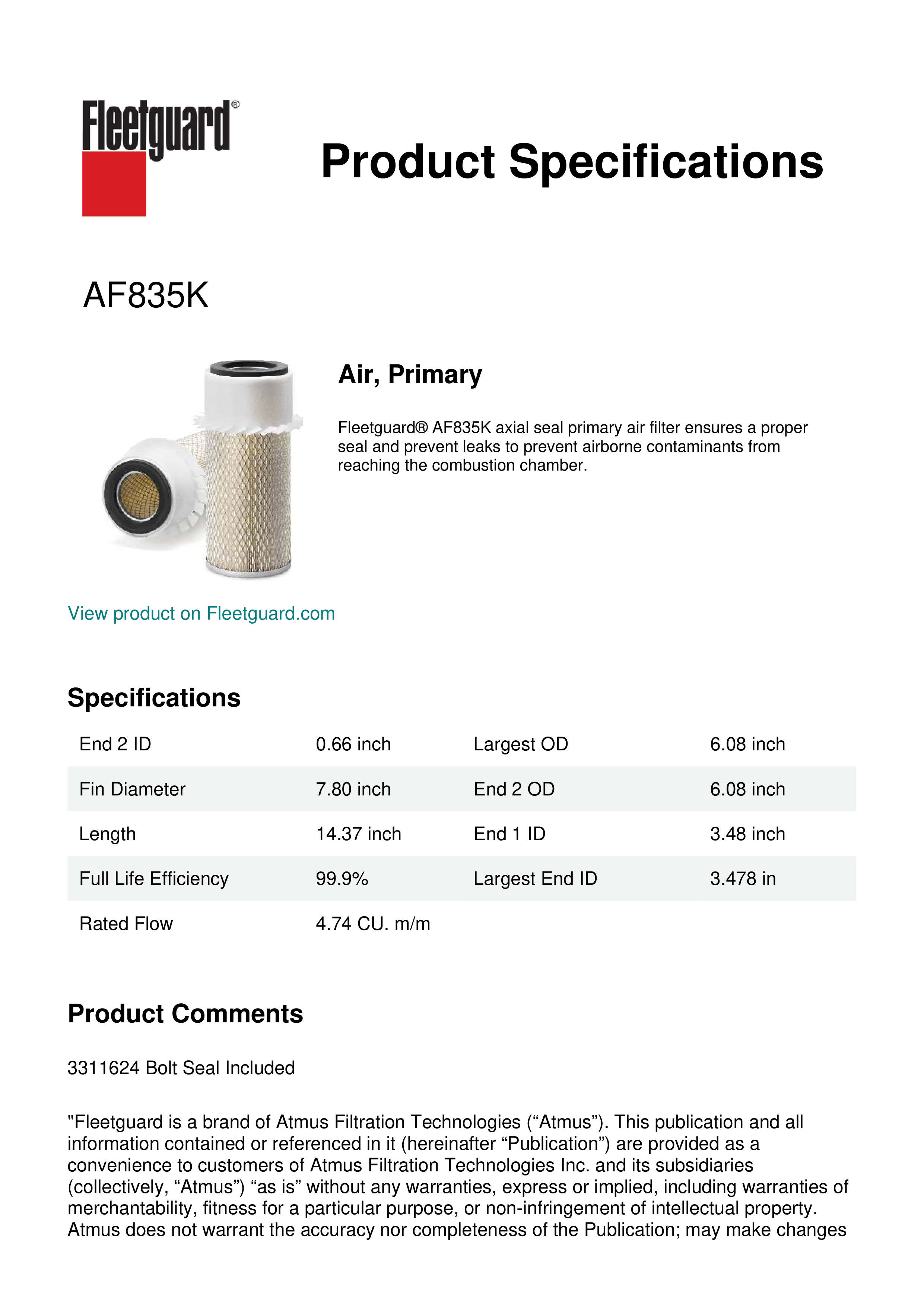 Fleetguard® AF835K axial seal primary air filter ensures a proper seal and prevent leaks to prevent airborne contaminants from reaching the combustion chamber.Specification