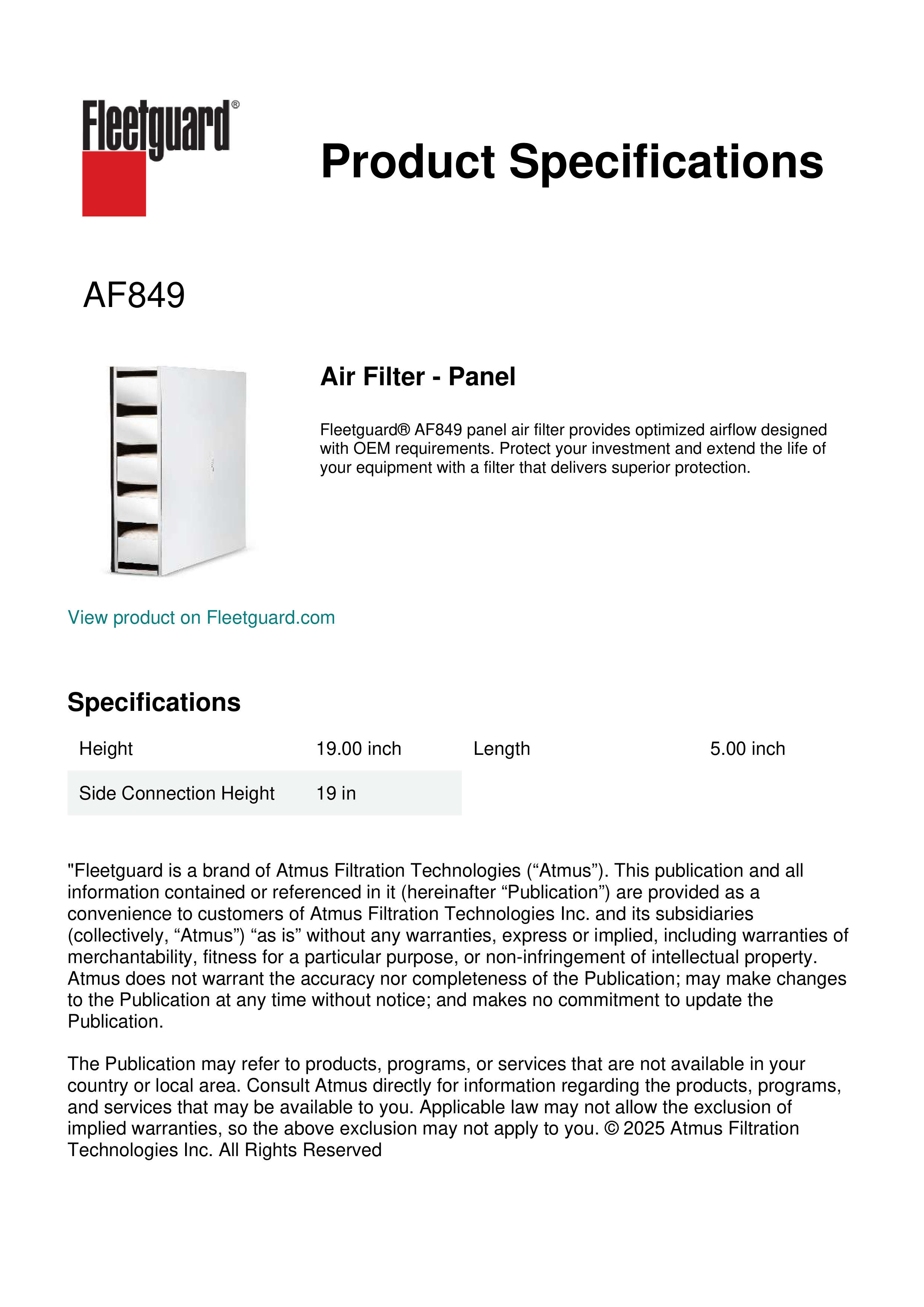 Fleetguard® AF849 panel air filter provides optimized airflow designed with OEM requirements. Protect your investment and extend the life of your equipment with a filter that delivers superior protection.Specification