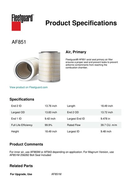 Fleetguard® AF851 axial seal primary air filter ensures a proper seal and prevent leaks to prevent airborne contaminants from reaching the combustion chamber.