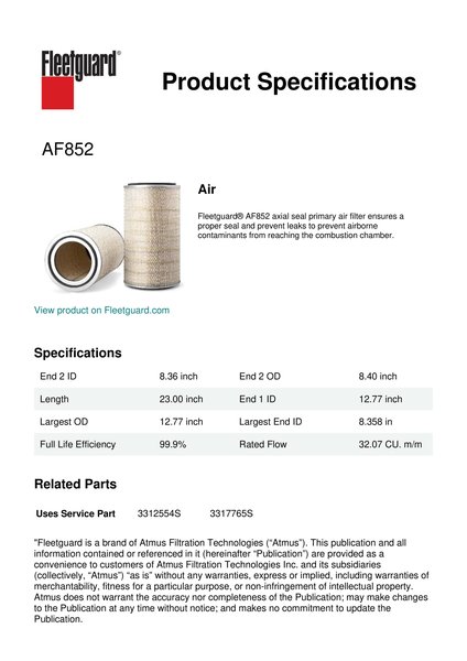 Fleetguard® AF852 axial seal primary air filter ensures a proper seal and prevent leaks to prevent airborne contaminants from reaching the combustion chamber.