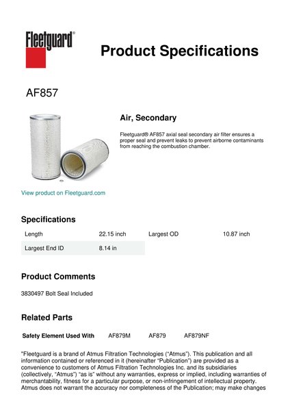 Fleetguard® AF857 axial seal secondary air filter ensures a proper seal and prevent leaks to prevent airborne contaminants from reaching the combustion chamber.Specification