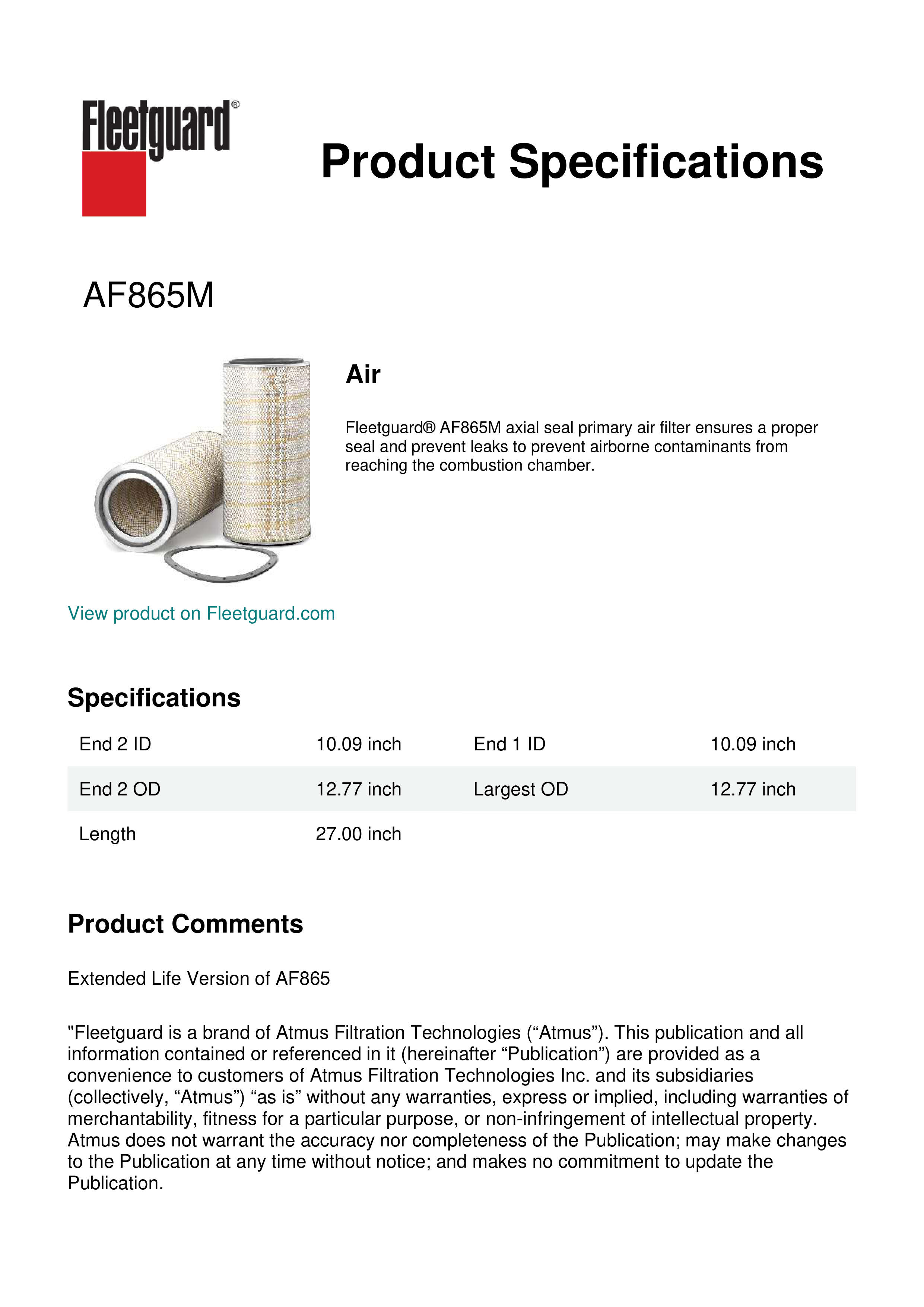 Fleetguard® AF865M axial seal primary air filter ensures a proper seal and prevent leaks to prevent airborne contaminants from reaching the combustion chamber.Specification