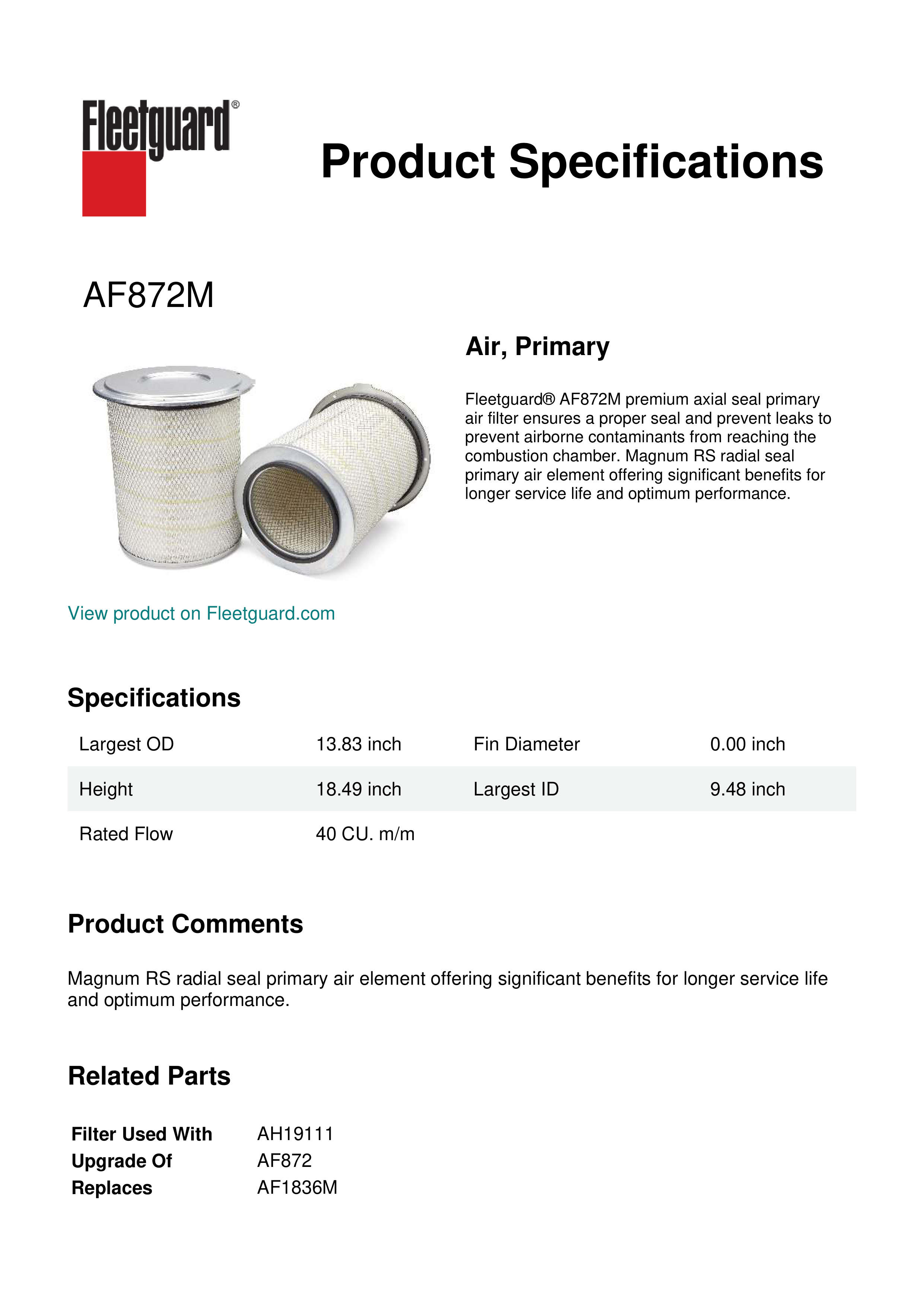 Fleetguard® AF872M premium axial seal primary air filter ensures a proper seal and prevent leaks to prevent airborne contaminants from reaching the combustion chamber. Magnum RS radial seal primary air element offering significant benefits for longer service life and optimum performance.Specification