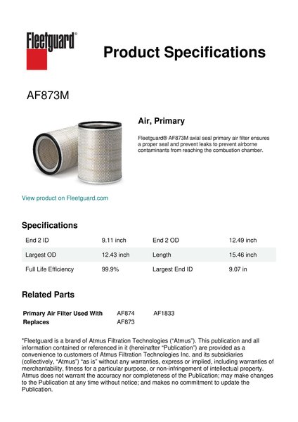 Fleetguard® AF873M axial seal primary air filter ensures a proper seal and prevent leaks to prevent airborne contaminants from reaching the combustion chamber.Specification