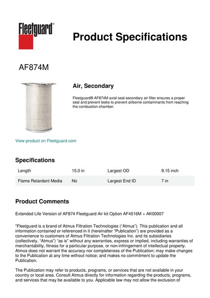 Fleetguard® AF874M axial seal secondary air filter ensures a proper seal and prevent leaks to prevent airborne contaminants from reaching the combustion chamber.Specification
